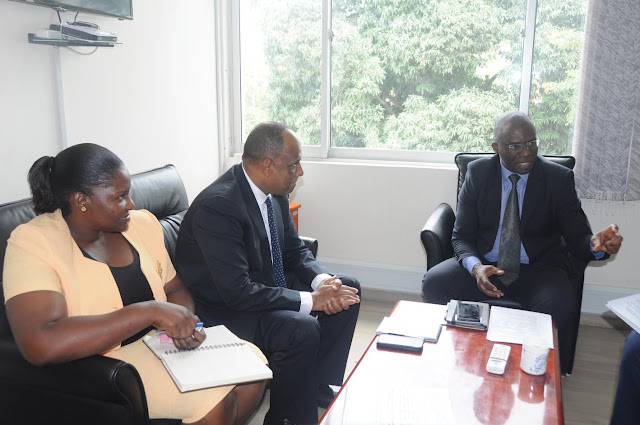 Mkurugenzi Mtendaji wa Bodi ya Mikopo ya Wanafunzi wa Elimu ya Juu (HESLB) Abdul- Razaq Badru (katikati) akifurahia jambo na Mkurugenzi wa Muungano kutoka Ofisi ya Makamu wa Rais (OMR) Balozi Mbarouk Nassor Mbarouk (kushoto) aliyefika katika Ofisi za HESLB Jijini Dar es Salaam jana (Agosti 20, 2020) akiwa katika ziara ya kikazi katika taasisi zinazohudumia pande mbili za Muungano, Tanzania Bara na Zanzibar. Kulia (koti jeupe) ni Mkuu wa Mawasiliano HESLB, Omega Ngole.(PICHA NA HESLB)