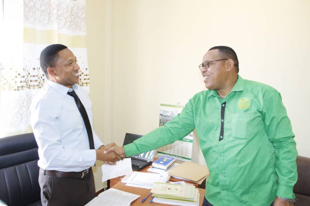 Msimamizi wa uchaguzi wilaya ya Ikungi Justice Kijazi akisalimiana na mgombea ubunge wa Jimbo la Singida Mashariki kwa tiketi ya CCM Miraji Mtaturu kabla ya kumkabidhi fomu ya kugombea jimbo hilo.