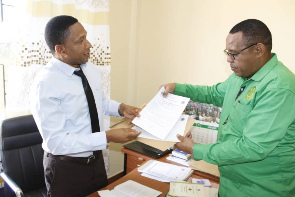 Msimamizi wa uchaguzi wilaya ya Ikungi Justice Kijazi akimkabidhi fomu mgombea ubunge wa Jimbo la Singida Mashariki kwa tiketi ya CCM Miraji Mtaturu.