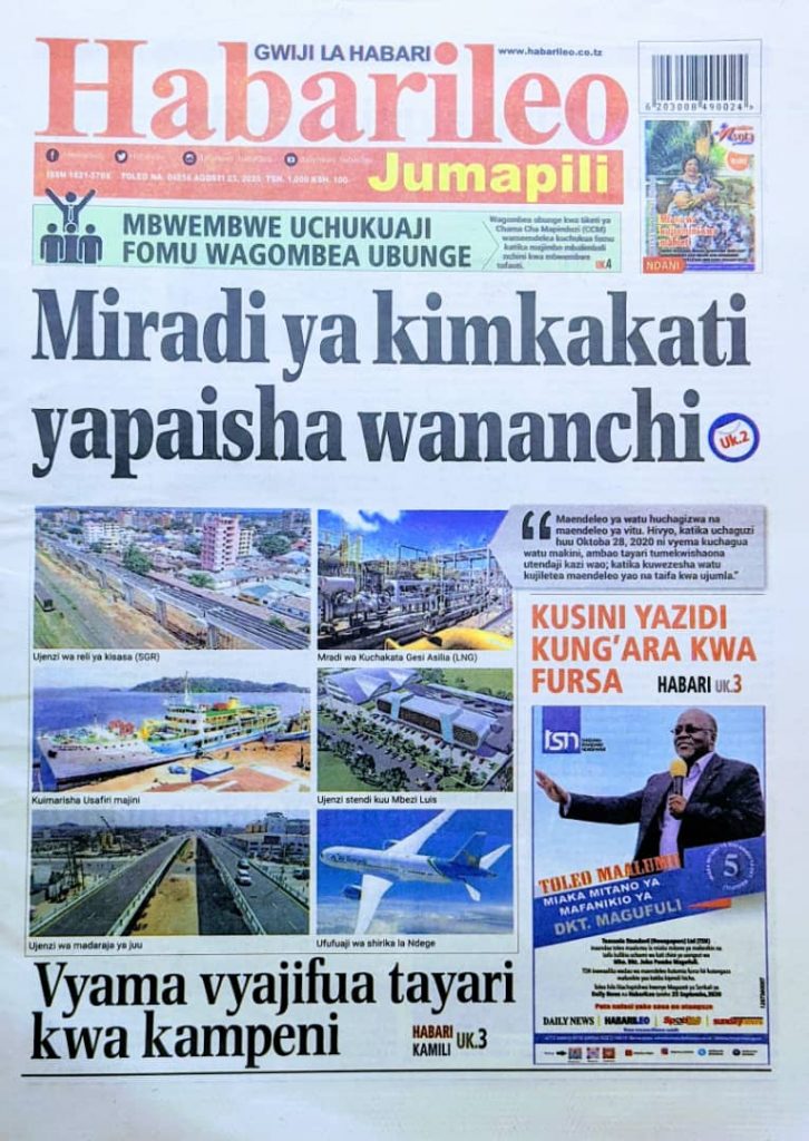 MagazetiPITIA VICHWA VYA HABARI KATIKA MAGAZETI YA LEO AUGUST 23,2020 Last updated: 2020/08/23 at 4:01 AM Alex Sonna 5 years ago Share SHARE Alex Sonna August 23, 2020 August 23, 2020 Share this Article Facebook Twitter Email Print Previous Article RC NDIKILO ATOA MUDA WA SIKU SABA KWA MFUGAJI ALIYEMBAKA BIBI KIZEE MKULIMA KUKAMATWA MARA MOJA Next Article LIVE: RAIS MAGUFULI AKIFUNGUA KANISA LA JIMBO KUU KATOLIKI DODOMA