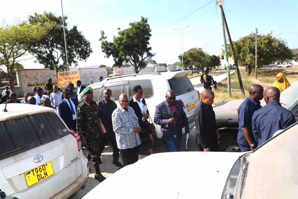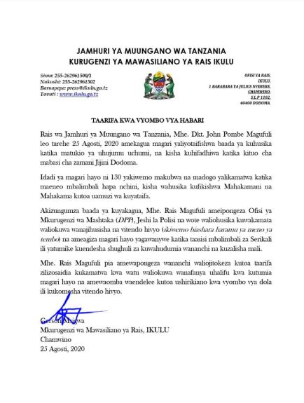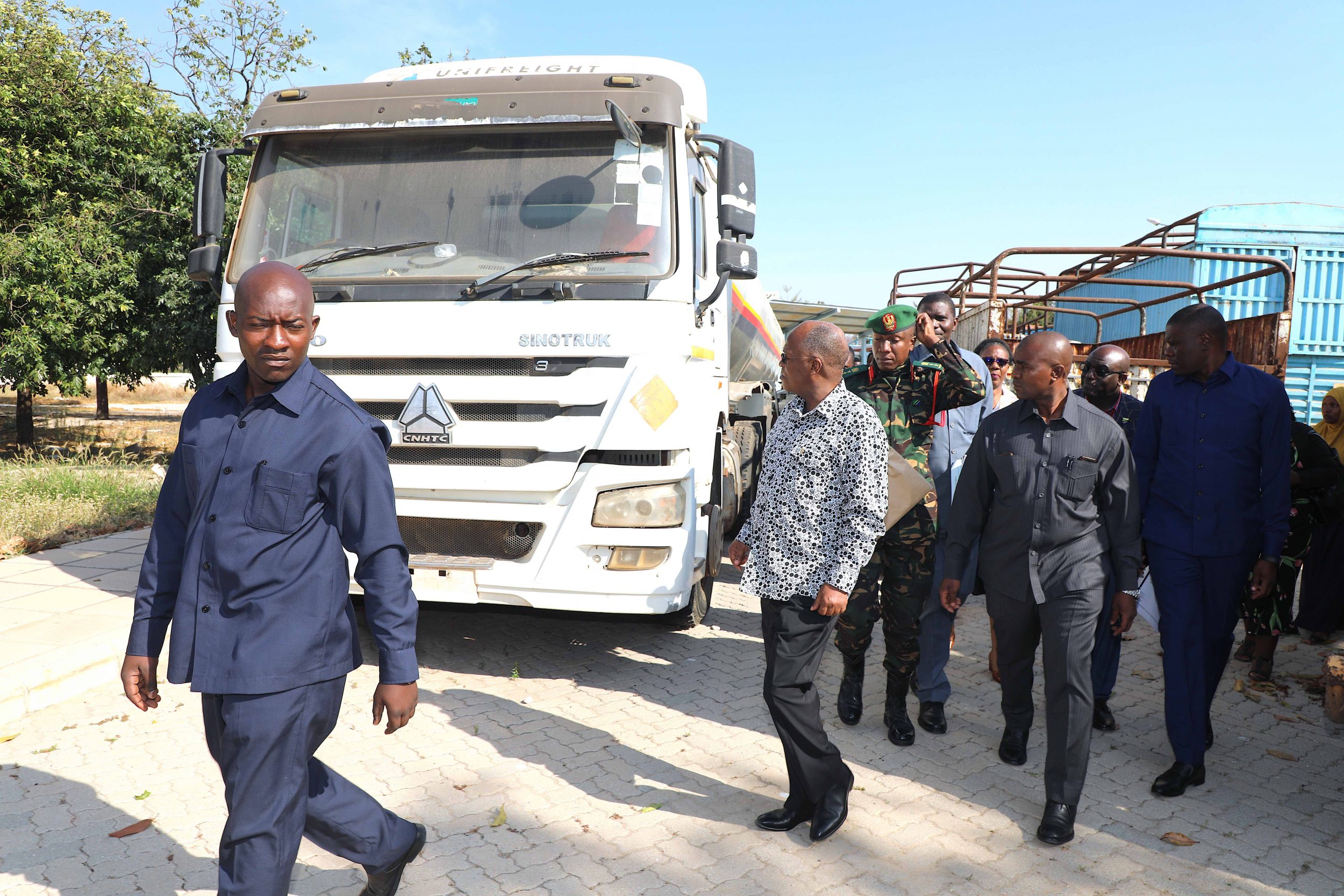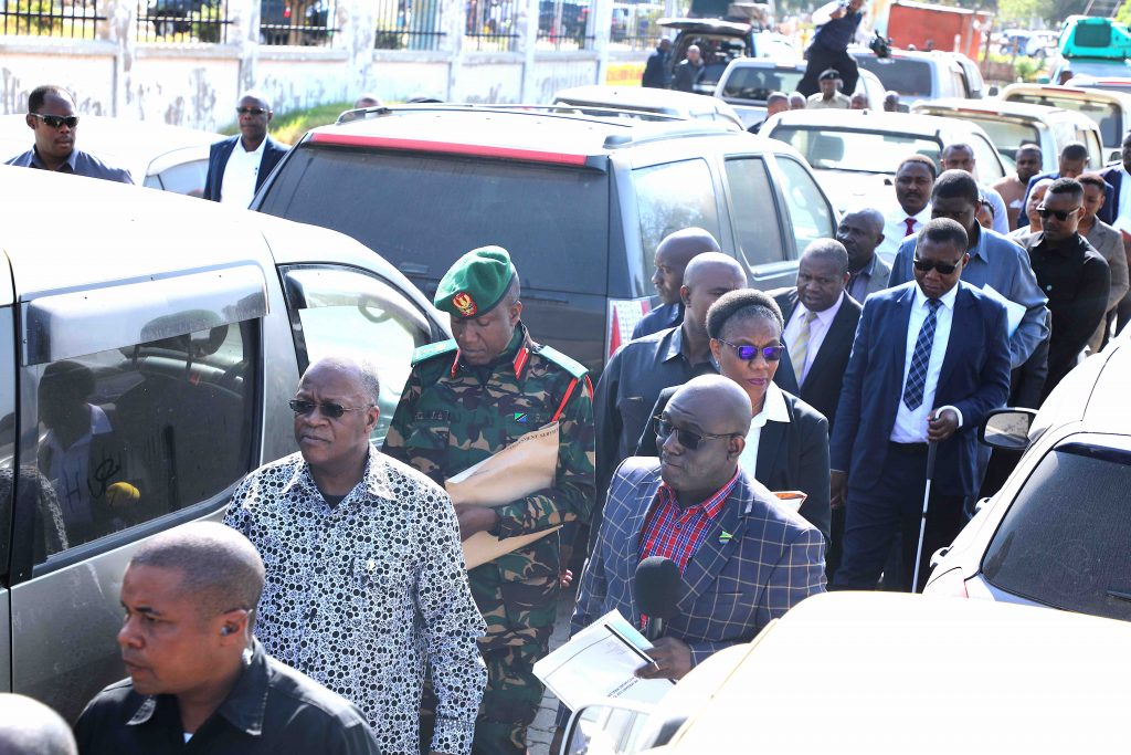 Rais wa Jamhuri ya Muungano wa Tanzania Dkt. John Pombe Magufuli akikagua magari makubwa na madogo 130 yaliyotaifishwa baada ya kuhusika katika matukio mbalimbali ya uhujumu yaliyohifadhiwa kituo cha mabasi cha zamani jijini Dodoma leo Jumanne Agosti 25, 2020