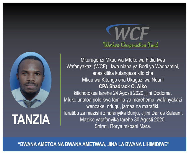 MKURUGENZI Mkuu wa Mfuko wa Fidia kwa Wafanyakazi (WCF) , kwa niaba ya Bodi ya Wadhamini, anasikitika kutangaza kifo cha Mkuu wa Kitengo cha Ukaguzi wa Ndani CPA Shadrack O. Aiko kilichotokea tarehe 24 Agosti, 2020 jijini Dodoma.