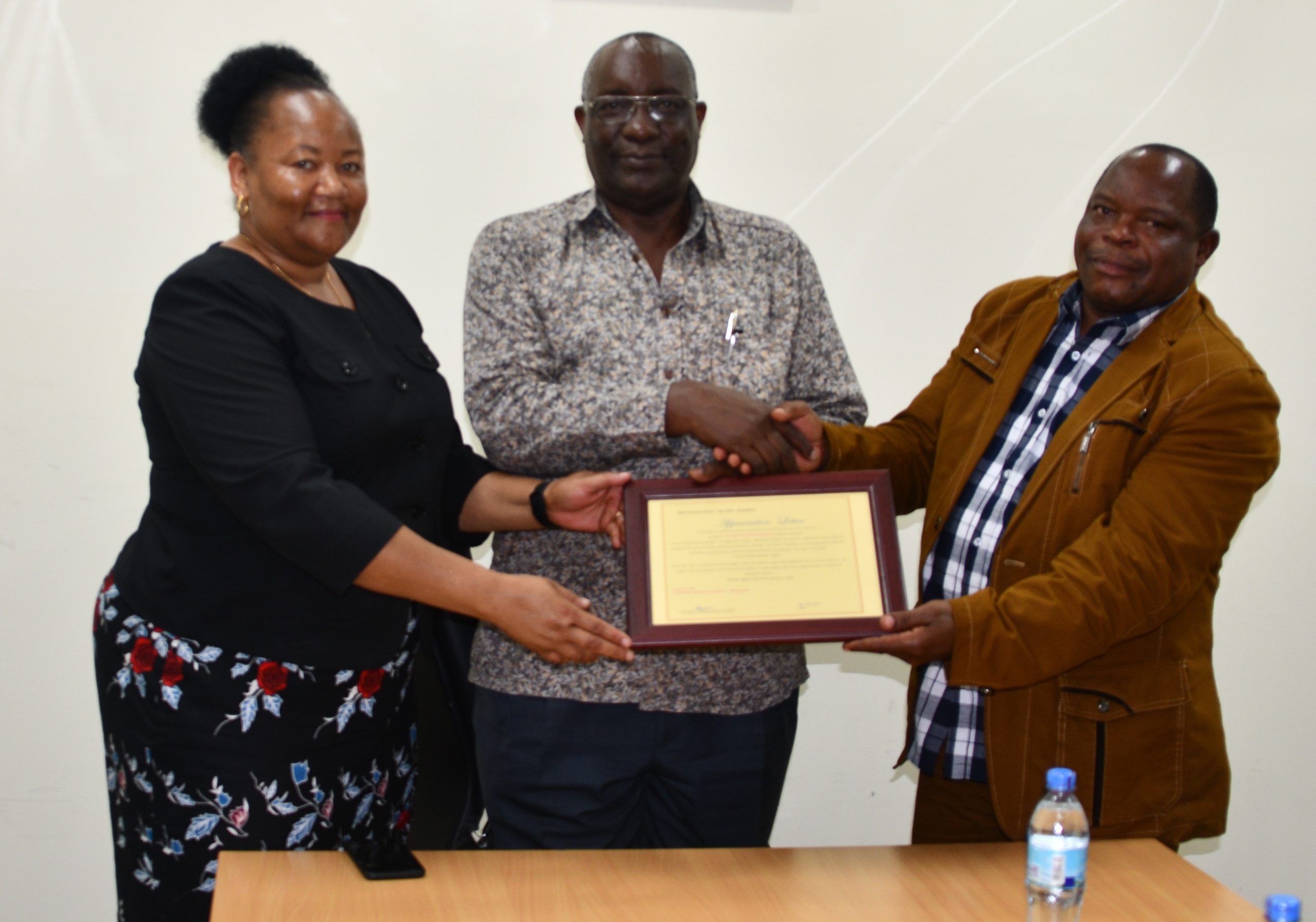 Mkurugenzi Mtendaji wa Hospitali ya Taifa Muhimbili Upanga & Mloganzila Prof .Lawrence Museru (katikati), pamoja na Kaimu Naibu Mkurugenzi Mtendaji wa Muhimbili – Mloganzila (kushoto) Dkt. Julieth Magandi wakipokea cheti cha shukrani kutoka kwa mwakilishi wa Familia ya Wanyumbani Bw. Fakihi Rashid Bakiri.