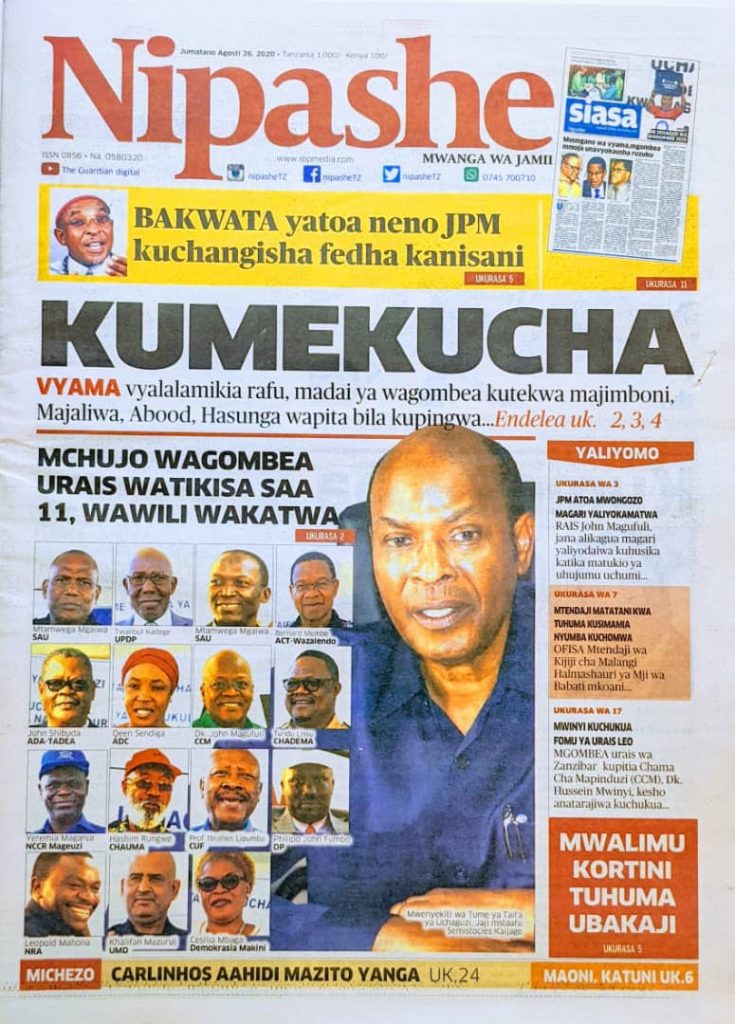 MagazetiUncategorizedPITIA VICHWA VYA HABARI KATIKA MAGAZETI YA LEO AUGUST 26,2020 Last updated: 2020/08/26 at 4:31 AM Alex Sonna 5 years ago Share SHARE Alex Sonna August 26, 2020 August 26, 2020 Share this Article Facebook Twitter Email Print Previous Article RC MAHENGE AKABIDHI MILIONI 30 KUTOKA KWA WADAU KWA AJILI YA UJENZI WA MSIKITI WA CHAMWINO Next Article ARSENAL YAICHAPA 4-1 MK DONS MECHI YA KIRAFIKI KUJIANDAA KUIVAA LIVERPOOL