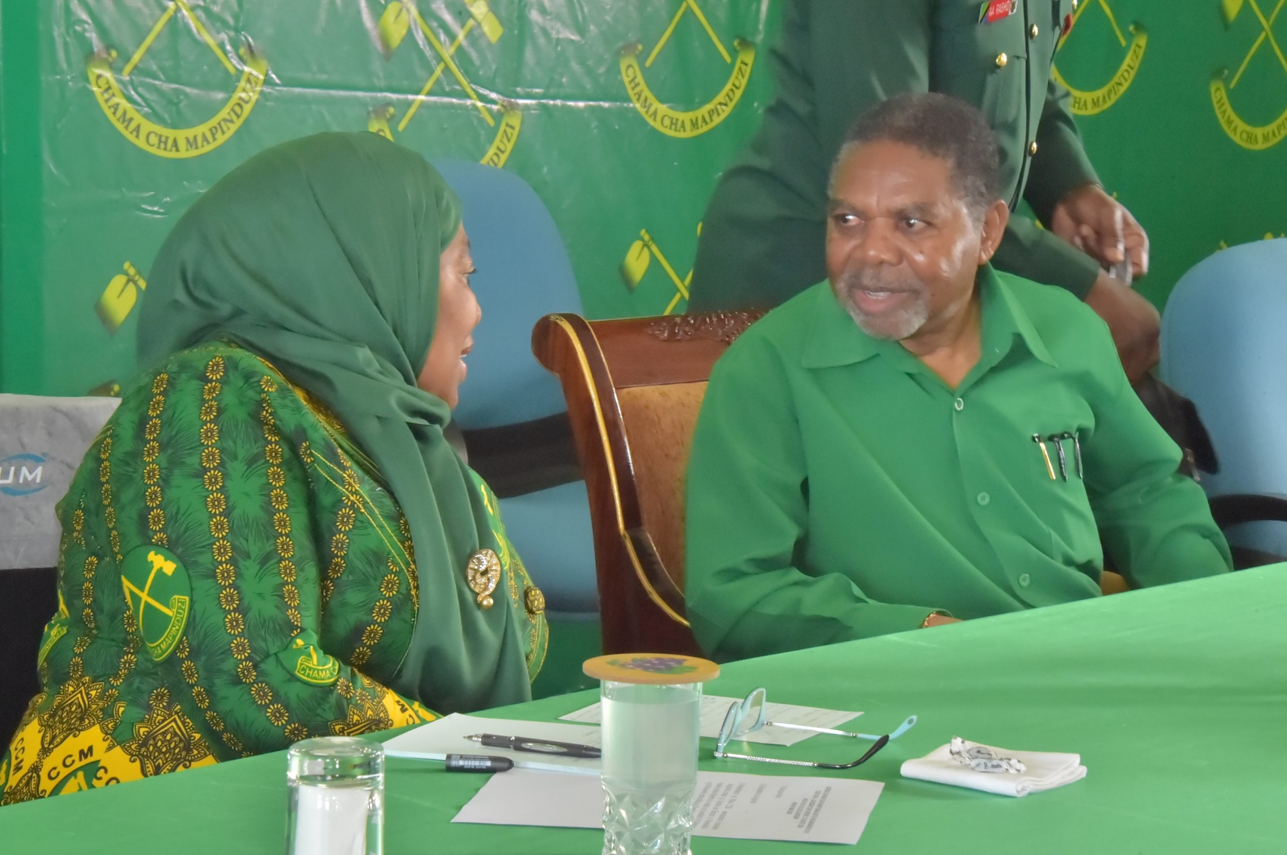 Rais wa Zanzibar na Mwenyekiti wa Baraza la Mapinduzi na Makamo Mwenyekiti wa CCM Zanzibar Dk.Ali Mohamed Shein akiteta jambo na Makamo wa Rais wa Jamhuri ya Muungano wa Tanzania na Mjumbe wa kamati Kuu ya CCM Taifa Mama Samia Suluhu Hassan wakati wa kikao cha kamati Maalum ya Halmashauri Kuu ya CCM Taifa (NEC) kinachojadili wagombea Uwakilishi wa CCM majimbo ya Zanzibar katika Ukumbi wa Ofisi Kuu ya CCM Kisiwandui Mjini Zanzibar leo.