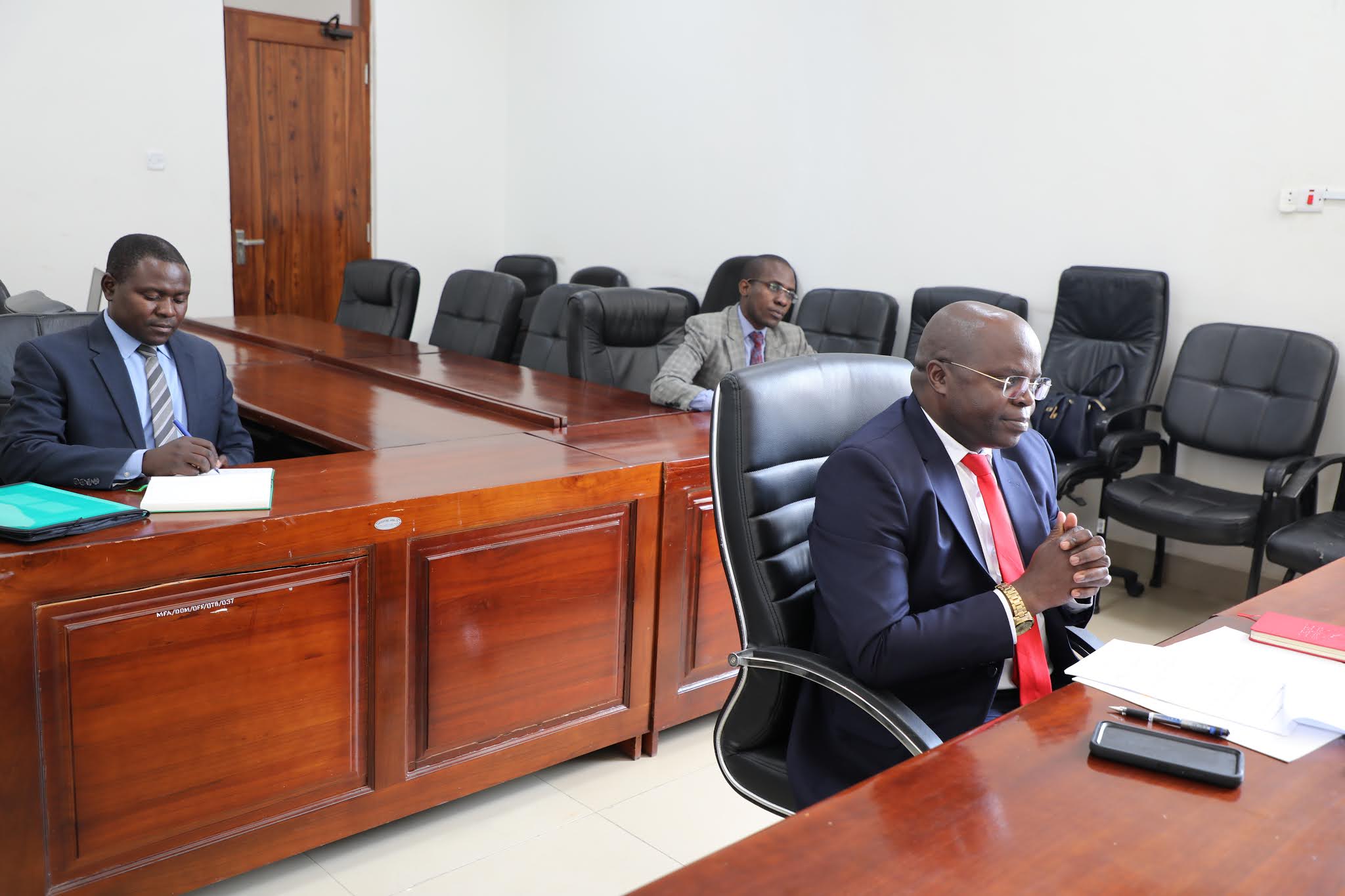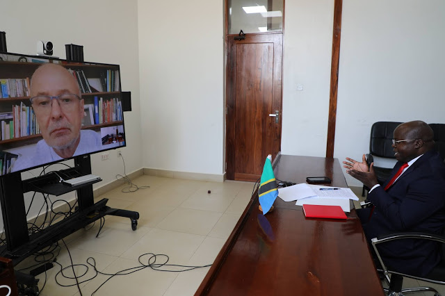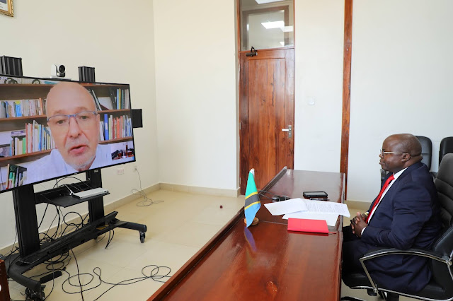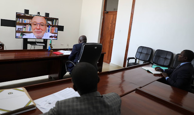 | Balozi Ibuge akimsikiliza Balozi Peter van Acker wakati wa mazungumzo yao yaliyofanyika kwa njia ya mtandao. |
