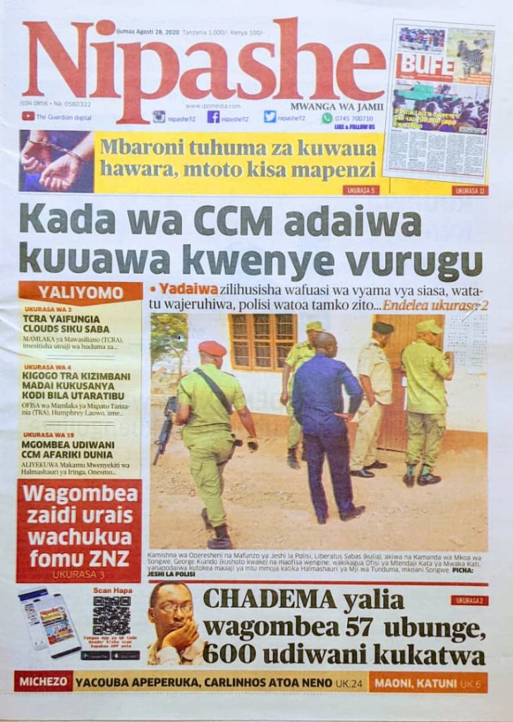 MagazetiPITIA VICHWA VYA HABARI KATIKA MAGAZETI YA LEO AUGUST 28,2020 Last updated: 2020/08/28 at 3:54 AM Alex Sonna 5 years ago Share SHARE Alex Sonna August 28, 2020 August 28, 2020 Share this Article Facebook Twitter Email Print Previous Article WORLD VISION YATUMIA SHILINGI BILIONI 12.7 KATIKA MIRADI MBALIMBALI YA MAENDELEO Next Article SERIKALI YAZISHUKURU UFARANSA, NORWAY KUCHANGIA MIRADI YA UMEME VIJIJINI