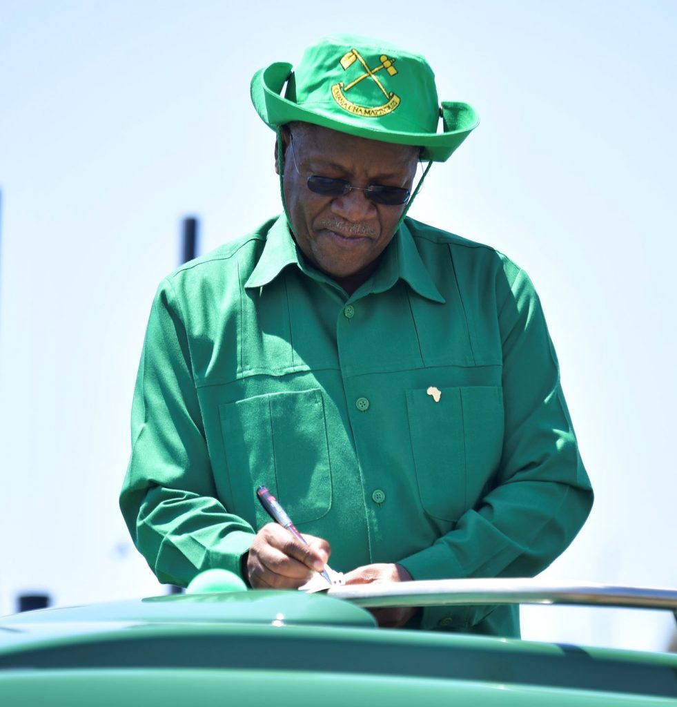 Mgombea Urais kupitia Chama cha Mapinduzi CCM, Rais wa Jamhuri ya Muungano wa Tanzania Mheshimiwa Dkt. John Pombe Magufuli akiandika jambo katika hotuba yake kabla ya kuanza kuzungumza na Wananchi wa Ikungi mkoani Singida. (PICHA NA IKULU)