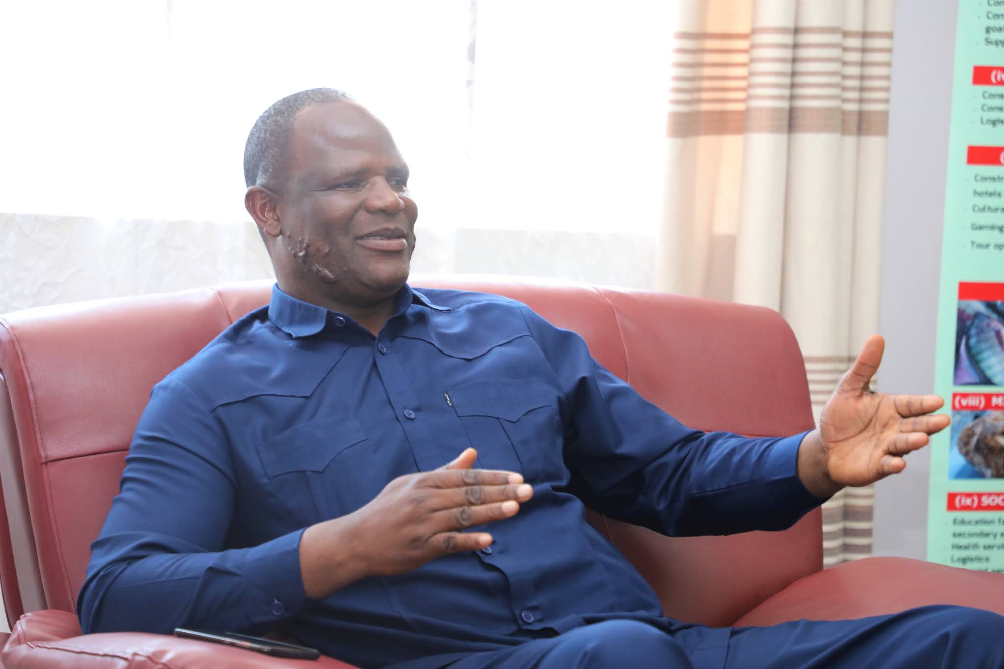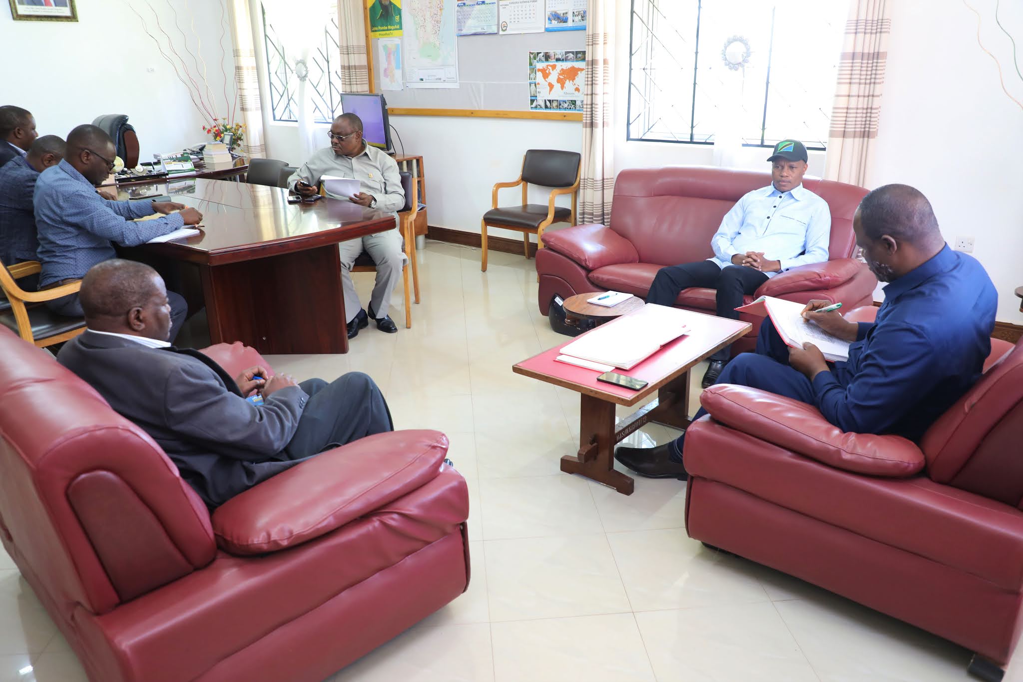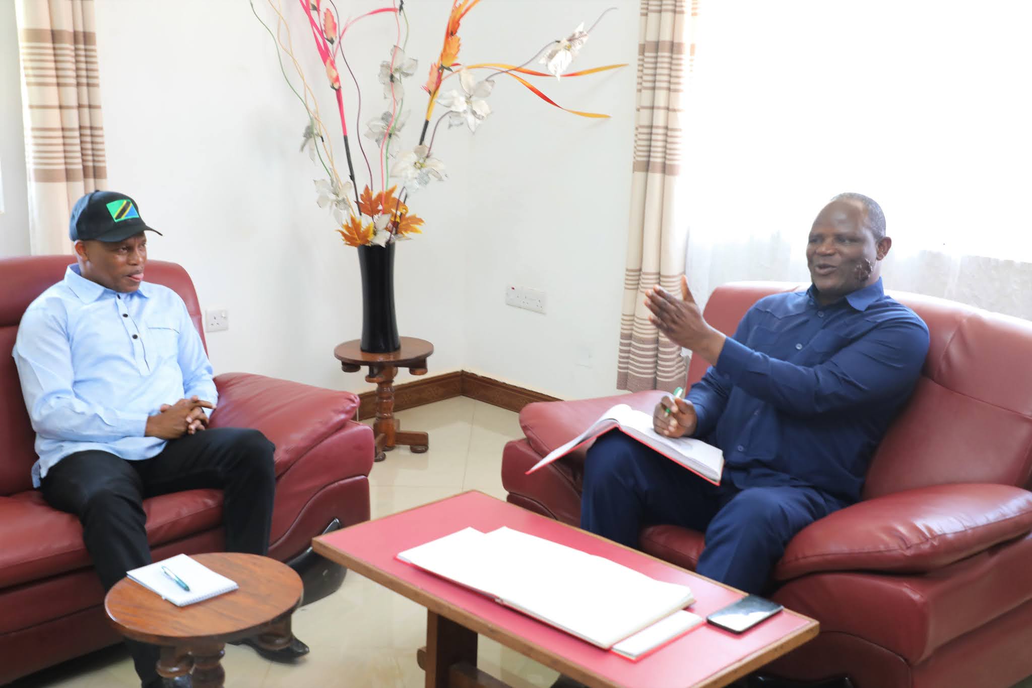 Waziri wa Kilimo Japhet Hasunga akizungumza na Mkuu wa Mkoa wa Kagera Brigedia Jenerali Marco Gaguti mara baada ya kuwasili ofisini kwake kwa ajili ya ziara ya kikazi Leo tarehe 2 Septemba 2020. (Picha Zote Na Mathias Canal, Wizara ya Kilimo)
