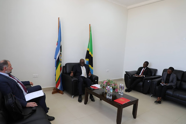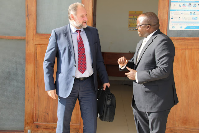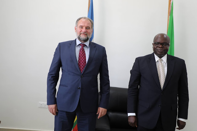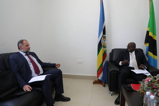 | Katibu Mkuu wa Wizara ya Mambo ya Nje na Ushirikiano wa Afrika Mashariki, Balozi Ibuge akiwa katika picha ya pamoja na Mratibu Mkazi wa Umoja wa Mataifa nchini, Bw. Milišić mara baada ya kukamilisha mazungumzo yao. |