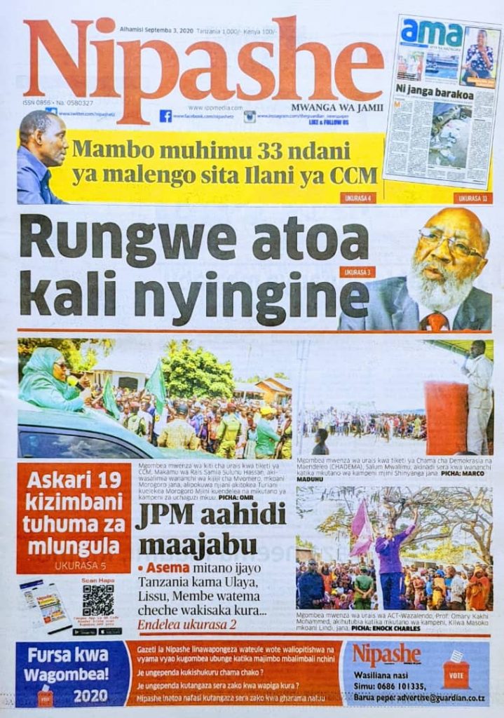 MagazetiPITIA VICHWA VYA HABARI KATIKA MAGAZETI YA LEO SEPTEMBER 3,2020 Last updated: 2020/09/03 at 3:56 AM Alex Sonna 6 years ago Share SHARE Alex Sonna September 3, 2020 September 3, 2020 Share this Article Facebook Twitter Email Print Previous Article BASHE AAHIDI KURA NYINGI NZEGA, ASEMA WALIMPINGA YESU, MTUME MUHAMAD LAKINI DINI HAZIKUSIMAMA Next Article BODI YA MIKOPO YATOA HUDUMA MAONESHO YA TCU VIWANJA VYA TCU