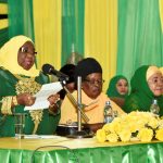 Mgombea Urais wa Chama Cha Mapinduzi (CCM) Rais wa Jamhuri ya Muungano wa Tanzania Mheshimiwa Dkt. John Pombe Magufuli akizungumza jambo na Mjane wa Baba wa Taifa Mama Maria Nyerere ambaye alimuombea Kura katika mkutano wa Kampeni za Urais kwa upande wa CCM zilizofanyika katika viwanja wa Mukendo mkoani Mara.