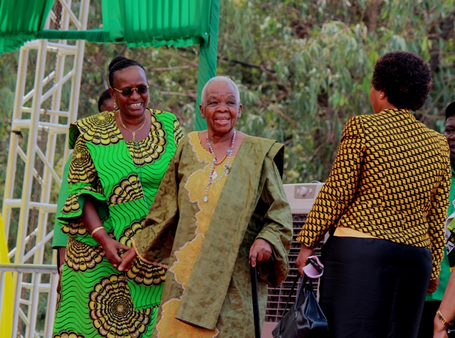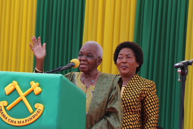 Mke wa Rais Mama Janeth Magufuli akifurahia jambo na Mjane wa baba wa Taifa Mama Maria Nyerere katika mkutano wa kampeni wa mgombea kupitia Chama cha Mapinduzi (CCM) Dk. John Pombe Magufuli.