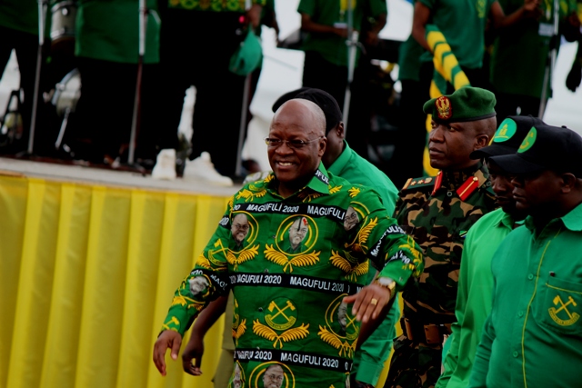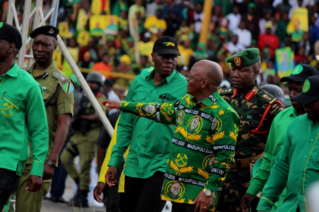 Mgombea Urais wa Tanzania kupitia Chama cha Mapinduzi (CCM) Rais Dk. John Pombe Magufuli akiwapungia wananchi mkono mara baada ya kuwasili kwenye mkutano wa kampeni mkubwa unaofanyika kwenye uwanja wa CCM Kirumba jijini Mwanza muda huu kwa ajili ya kuwahutubia wananchi waliofurika uwanjani hapo ili kumsikiliza