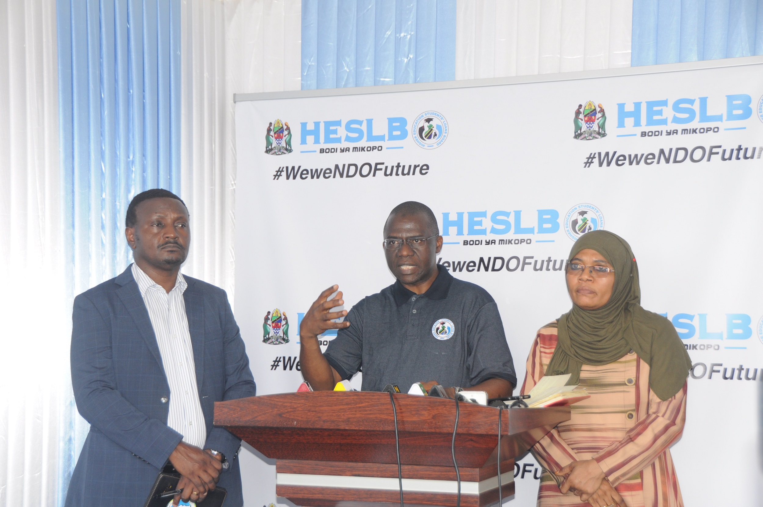 Mkurugenzi Mtendaji wa Bodi ya Mikopo ya Wanafunzi wa Elimu ya Juu (HESLB) Abdul-Razaq Badru (katikati) akizungumza na waandishi wa vyombo vya habari Agosti 31 mwaka huu kuhusu kuongezwa kwa muda katika dirisha la maombi ya mikopo kwa wanafunzi wa elimu ya juu katika mwaka wa masomo 2020/21. Kushoto ni Meneja Masoko wa Wakala wa Usajili, Ufilisi na Udhamini (RITA) Joseph Kimaro na kulia ni Meneja Mkuu Uendeshaji Biashara wa Shirika la Posta Tanzania (TPC) Mwanaisha Said.