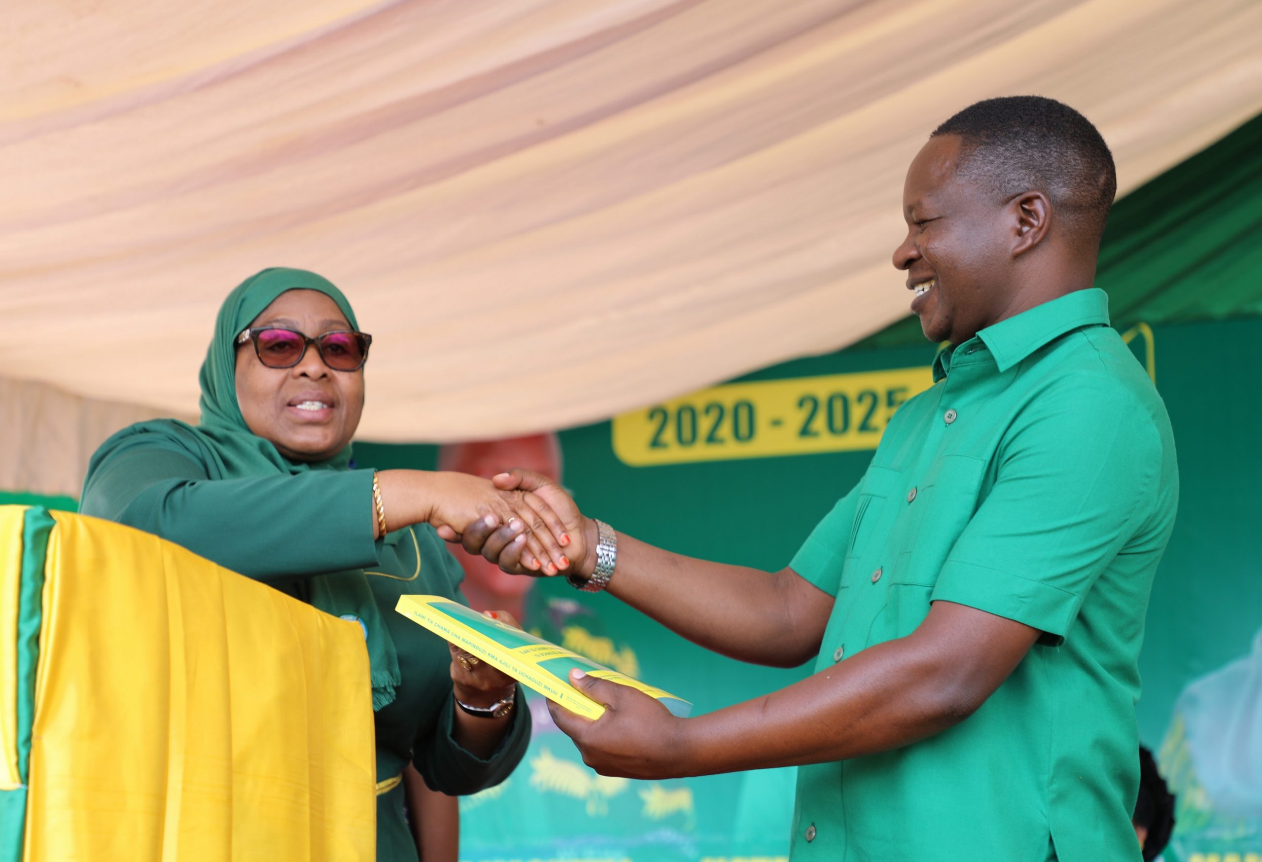 Mgombea Mwenza wa Kiti cha Urais wa Jamhuri ya Muungano wa Tanzania kwa tiketi ya CCM ambae pia ni Makamu wa Rais wa Jamhuri ya Muungano wa Tanzania Mhe. Samia Suluhu Hassan, akimkabidhi kitabu cha Ilani ya CCM ya 2020/25 Mbunge mteule kwa tiketi ya CCM Jimbo la Mahuta Tandahimba Katawi Ahmad Katawi kwa ajili ya kuinadi kwenye mikutano ya Kampeni wa Chama cha Mapinduzi CCM leo Septemba 11,2020.