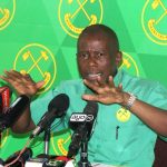 Bondia Imani Daidi Mapambano kushoto akituni shiana misuli na Japhert Kaseba Baada ya kusaini mkataba wa kuzipiga Novemba 28 utakaofanyika katika ukumbi wa Nextri Door Masaki katikati ni mratibu wa mpambano uho Amosi Nkondo ‘Amoma’.