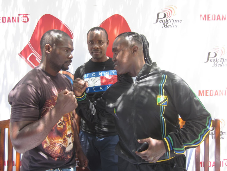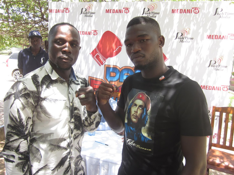 Bondia Paul Kamata kushoto akitunishiana misuli na Kanda Kabongo baada ya kusaini mkataba