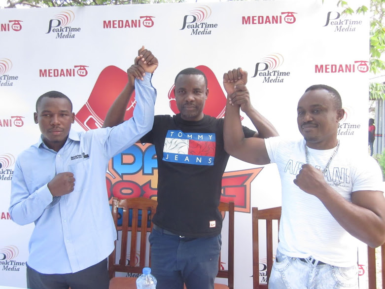Mratibu wa mpambano wa masumbwi Amosi Nkondo ‘Amoma’ katikati akiwainuwa mikono juu mabondia Paul Kamata kushoto na Kanda Kabongo.