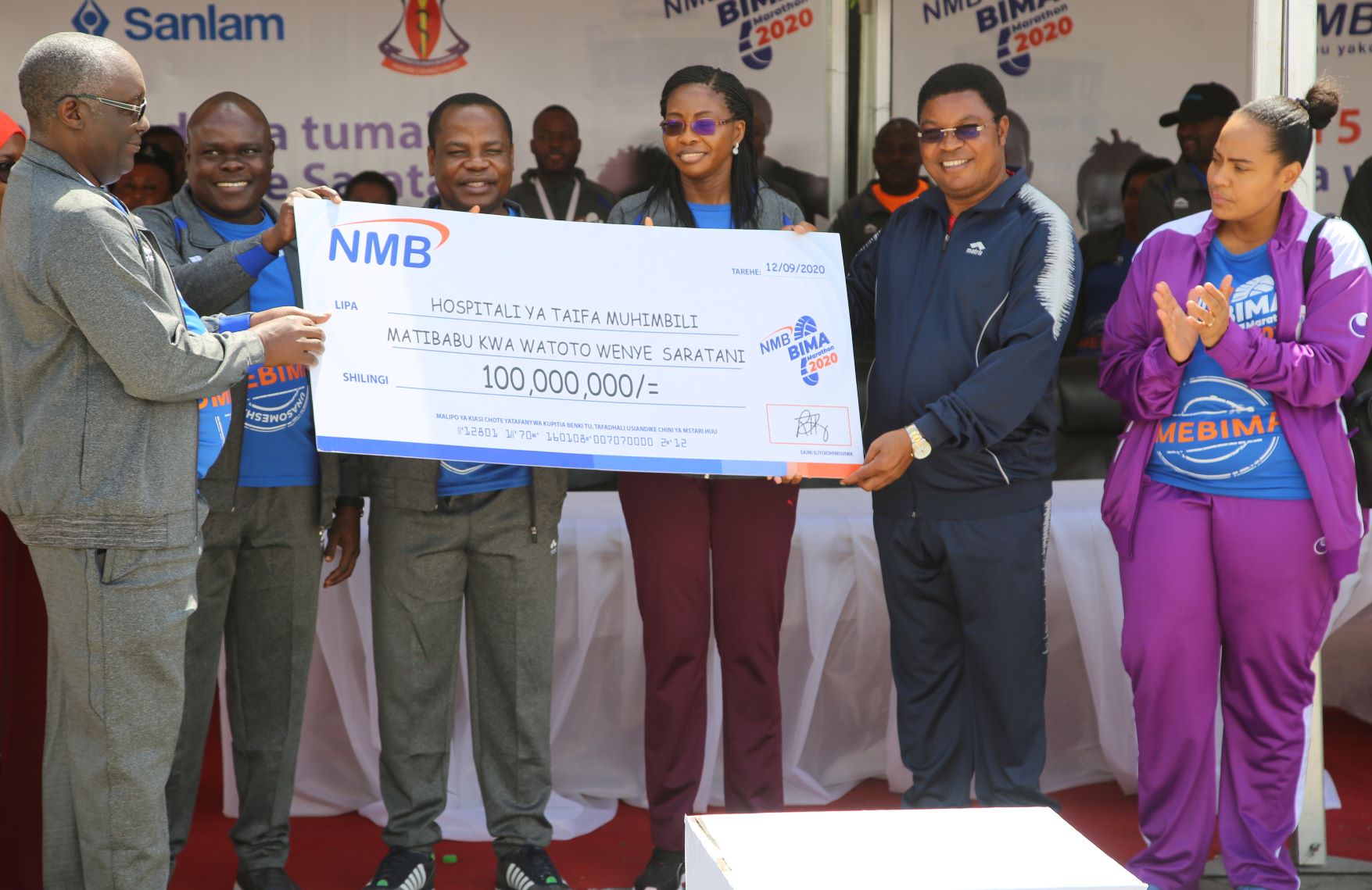 Waziri Mkuu, Kassim Majaliwa akimkabidhi hundi ya sh. Milioni 100 Mkurugenzi Mtendaji wa Hospitali ya Taifa Muhimbili, Profesa Lawrence Maseru, (kushoto) wakati alipohitimisha Mbio za NMB Marathon kwenye viwanja vya Mlimani City jijini Dar es salaam, Septemba 12, 2020. Kulia ni Waziri wa Nchi, Ofisi ya Waziri Mkuu, (Uwekezaji) Angellah Kairuki, wa tatu kulia ni Afisa Mtendaji Mkuu wa NMB, Ruth Zaipuna, wa pili kushoto ni Afisa Mtendaji Mkuu wa Kampuni ya Sanlam East Africa, Julius Magabe na wa tatu kushoto ni Mwenyekiti wa Bodi ya Wakurugenzi ya NMB, Dkt.Edwin Mhede. Fedha hizo zilizotolewa na Benki ya NMB zitatumika kuwasaidia watoto wenye ugonjwa saratani wanaotibiwa katika Hospitali ya Taifa ya Muhimbili. (Picha na Ofisi ya Waziri Mkuu)