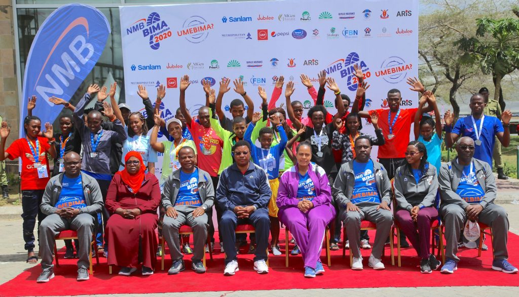 Waziri Mkuu, Kassim Majaliwa akiwa katika picha ya pamoja na viongozi pamoja na washindi wa Mbio za NMB Marathon baada ya kuwakabidhi zawadi washindi hao kwenye viwanja vya Mlimani City jijini Dar es salaam, Septemba 12, 2020. Wa nne kulia ni Waziri wa Nchi, Ofisi ya Waziri Mkuu, Uwekezaji, Angellah Kairuki , wa tatu kulia ni Mkuu wa Mkoa wa Dar es salaam, Abubakar Kunenge, Wa pili kulia ni Afisa Mtendaji Mkuu wa Benki ya NMB, Ruth Zaipuna na kulia ni Mkurugenzi Mtendaji, Hospitali ya Taifa Muhimbili, Profesa Lawrence Maseru. Kushoto ni Afisa Mtendaji Mkuu wa Kampuni ya Sanlam East Africa, Julius Magabe na wa tatu kushoto ni Mwenyekiti wa Bodi ya Wakurugenzi ya NMB, Dkt. Edwin Mhede.