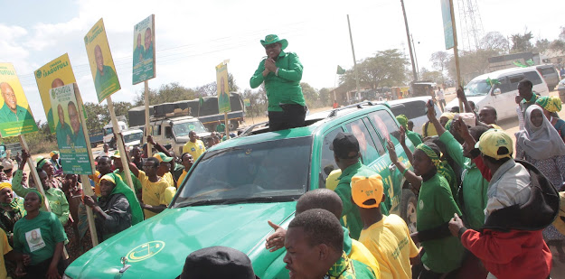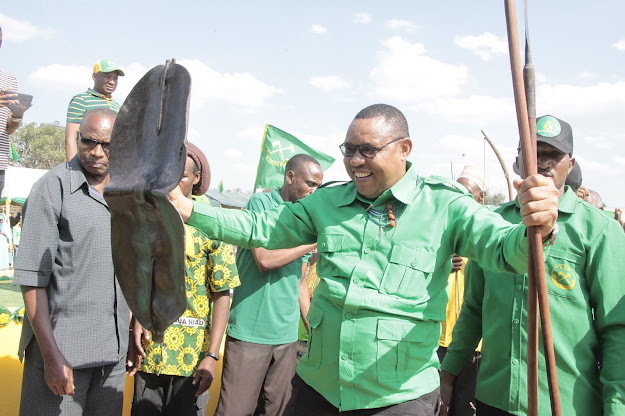 Mgombea Ubunge wa Jimbo la Singida Mashariki kupitia Chama Cha Mapinduzi (CCM) Miraji Mtaturu, akionesha ngao na mikuki aliyokabidhiwa na wazee wa kimila ikiwa ni ishara ya ushindi.