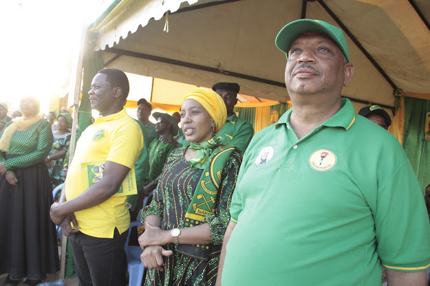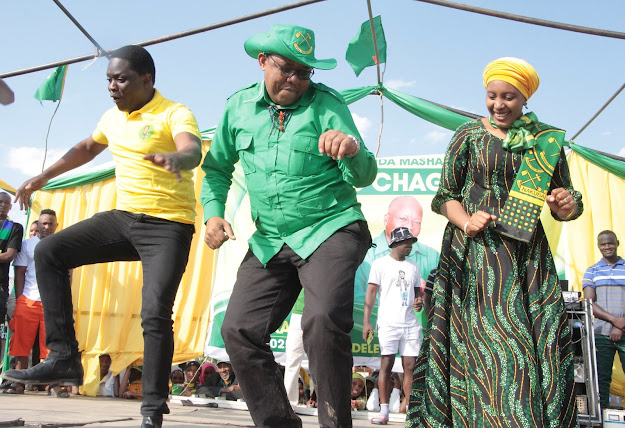 Mgombea Ubunge wa Jimbo la Singida Magharibi Elibariki Kingu (kushoto), Mgombea Ubunge wa Jimbo la Singida, Mashariki Miraji Mtaturu (katikati) na Mgombea Ubunge wa Viti Maalumu wa Mkoa wa Singida, Aysharose Mattembe wakiserebuka baada ya kupagawishwa na Msanii maarufu wa nyimbo za Sengeli Mzee wa Bwax.