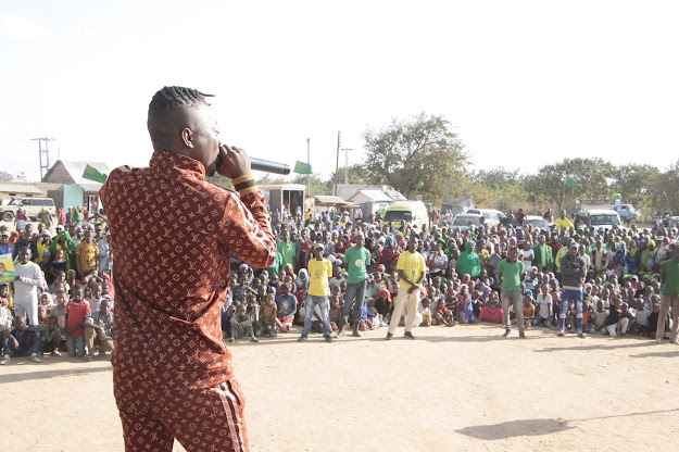 Mgombea Ubunge wa Jimbo la Singida Magharibi Elibariki Kingu, akimtuza Msanii wa kugani mashairi maarufu kwa jina la Kiherehere.