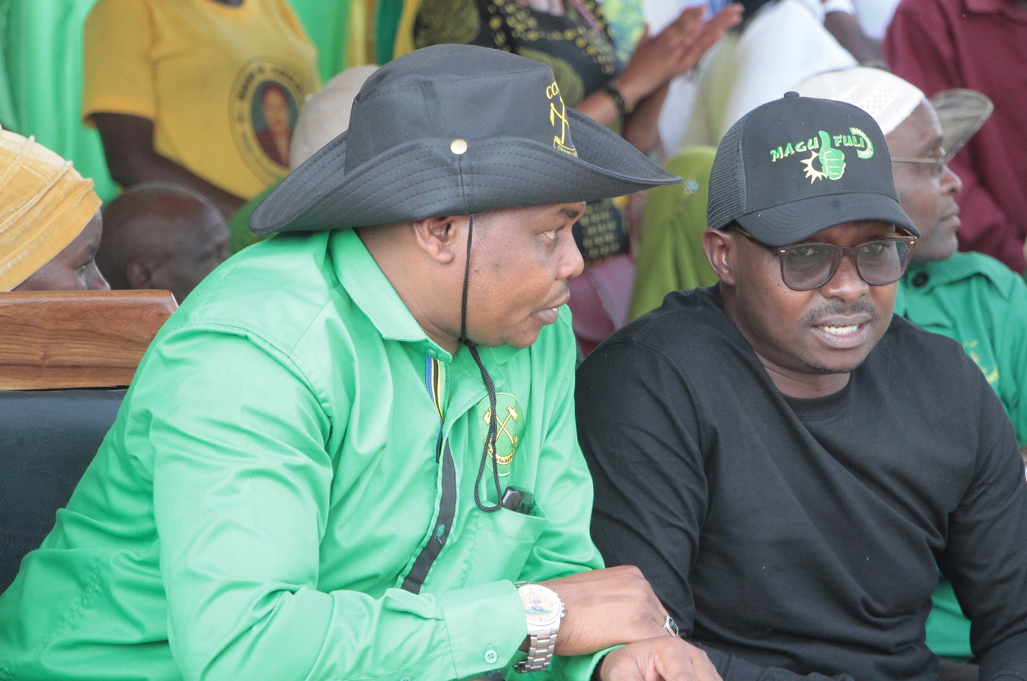 Mwenyekiti wa CCM wa Wilaya ya Ikungi, Mika Likapakapa (kushoto) akiteta jambo na Mjumbe wa Kamati ya Siasa, Edward Mpogolo.