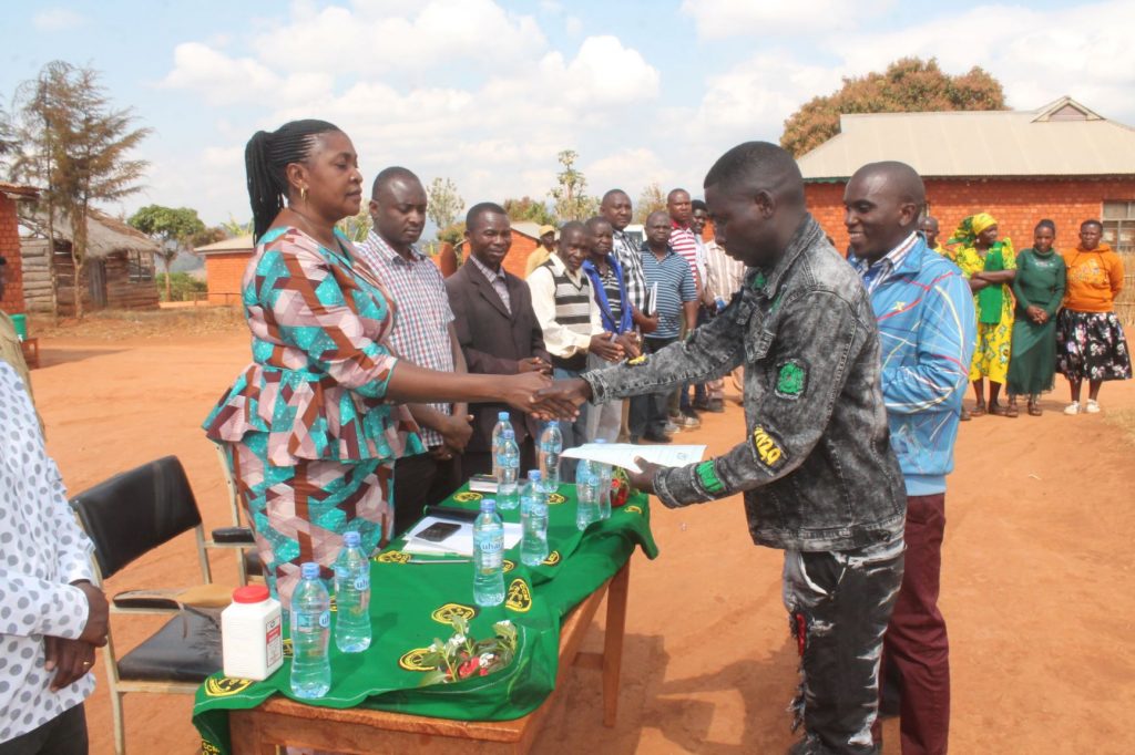 Mkuu wa Wilaya ya Nyasa Mh. Isabela Chilumba akiwakabidhi Cheti cha Usajili viongozi wa Kimbango Amkos katikaViwanja vya Ofisi ya Serikali ya kijiji cha Kimbango kata ya Luhangarasi Wilayani Nyasa, jana. Kushoto ni Mkurugenzi Mtendaji Wilaya ya Nyasa bw Jimson Mhagama. Picha na Ofisi ya ded Nyasa.