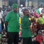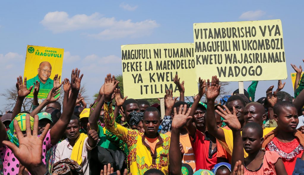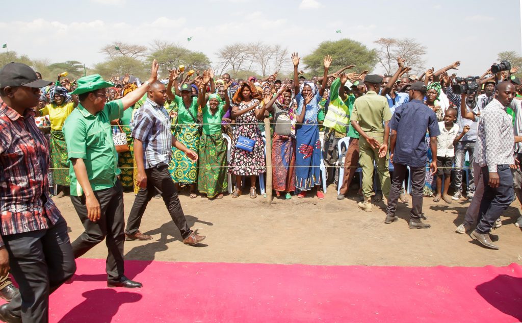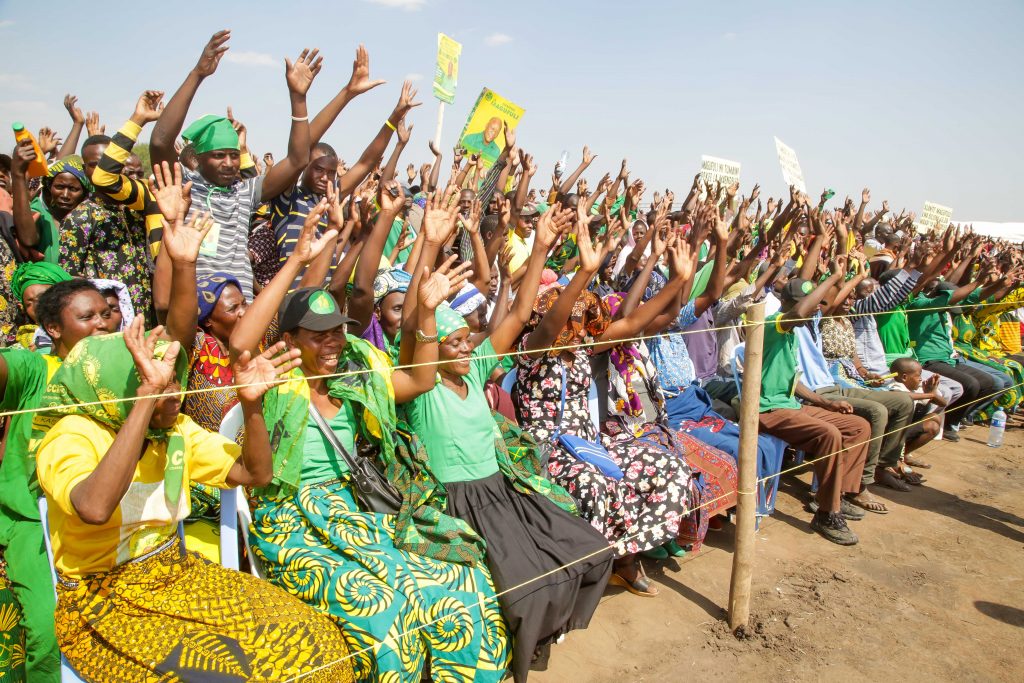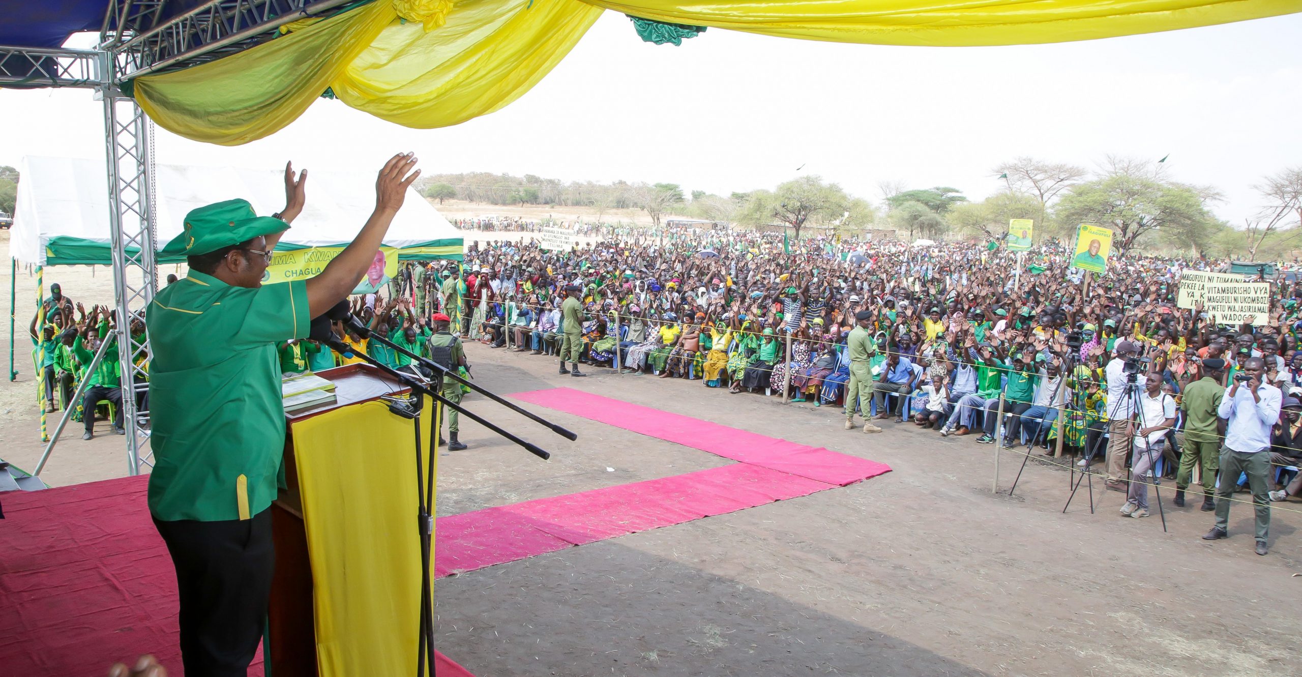 Wananchi wa jimbo la Itilima, wakionesha ishara ya mkono ya kumchagua Mgombea Urais wa CCM, Dkt. John Pombe Magufuli kwa miaka mitano tena, wakati Mjumbe wa Kamati Kuu, Kassim Majaliwa, akiwahutubia, katika mkutano wa kampeni uliyofanyika katika Kata ya Ligangabilili.