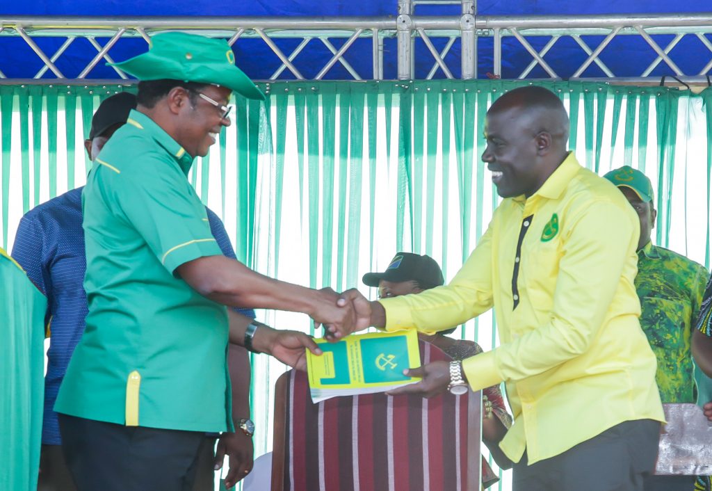 Mjumbe wa Kamati Kuu, Kassim Majaliwa, akiwakabidhi nakala ya Ilani ya Uchaguzi ya CCM ya 2020-2025 mgombea ubunge wa CCM wa jimbo la Itilima, Njalu Daudi Silanga, kwenye mkutano wa kampeni uliyofanyika, katika Kata ya Lagangabilili, wilayani Itilima. (Picha na Ofisi ya Waziri Mkuu)