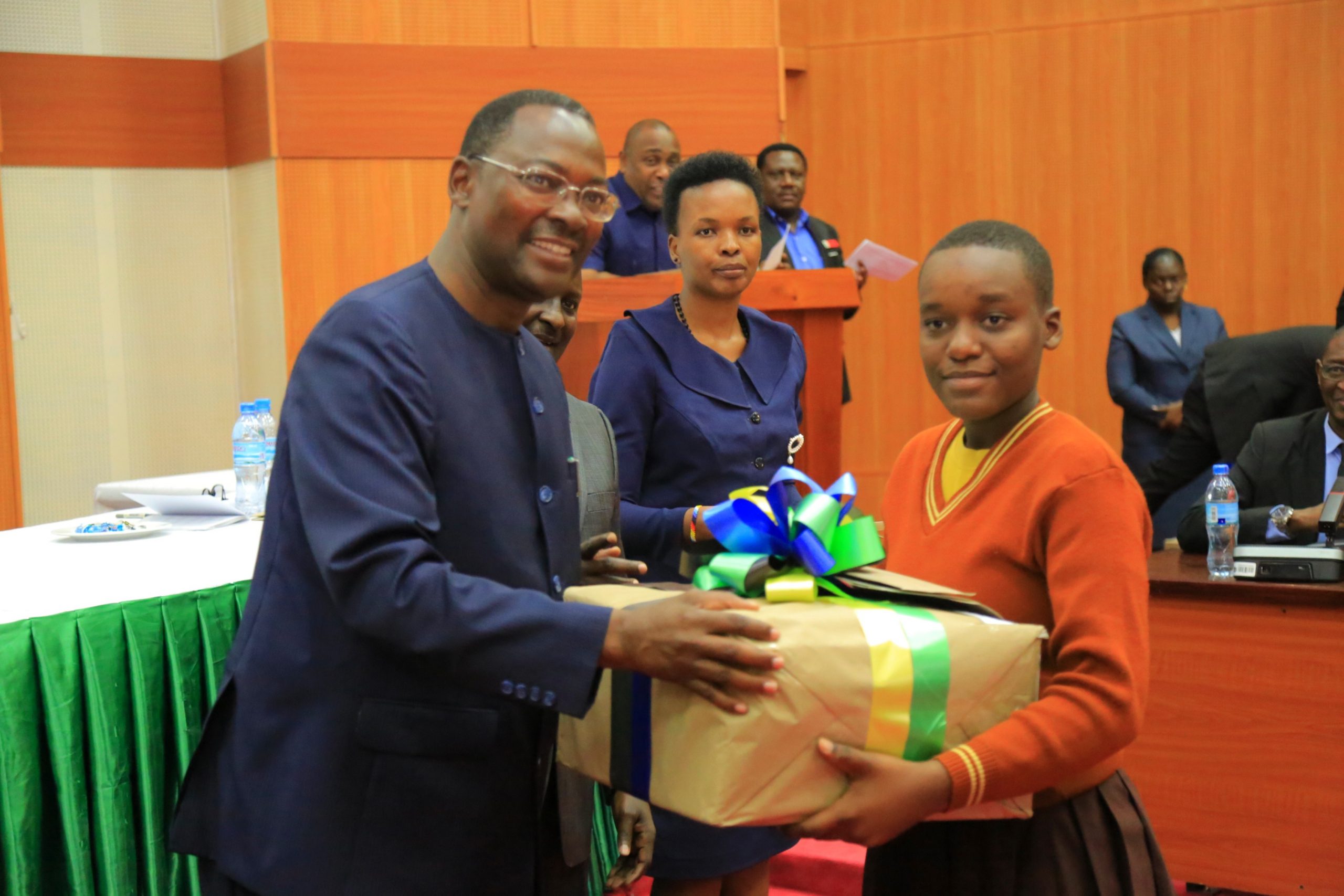 Waziri wa Mambo ya ndani ya nchi, George Simbachawene akikabidhi Kompyuta mpakato (Laptops) kwa wanafunzi mbalimbali waliojishindia zawadi kwa kuandika Insha kuhusu uhifadhi wa mazingira wakati wa maadhimisho ya miaka 35 ya uhifadhi wa tabaka la Ozone yaliyoandaliwa na Ofisi ya Makamu wa Rais na kufanyika Jijini Dodoma.