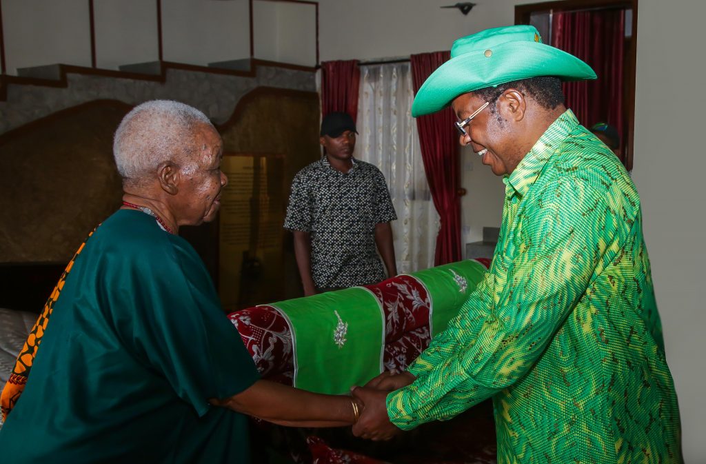 Mjumbe wa Kamati Kuu, Kassim Majaliwa, akimsalimia Mama Maria Nyerere, wakati alipomtembelea, nyumbani kwake Butiama, akiwa kwenye kampeni ya CCM mkoani Mara,