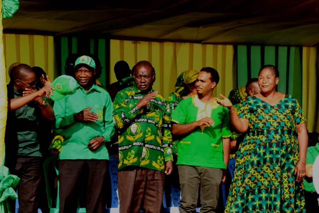 Mgombea Urais kupitia (CCM) Chama cha Mapinduzi ambaye pia ni Mwenyekiti wa chama hicho tawala na Rais wa Jamhuri ya Muungano wa Tanzania Dkt. John Pombe Magufuli akipunga mkono pamoja na viongozi mbalimbali alipowasili kwenye uwanja wa Milambo mjini Urambo mkoani Tabora ili kuhutubia wananchi na kisha kuelekea Tabora mjini kwa mikutano yake wa kampeni leo Jumatatui Septemba 21, 2020.