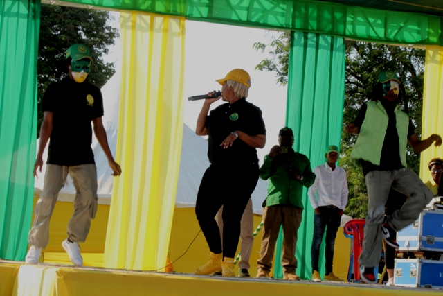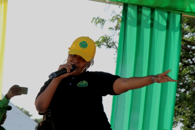 Msanii wa muziki wa Singeli Pam D. akifanya vitu vyake jukwaani katika mkutano wa kampeni wa mgombea Urais kupitia chama cha Mapinduzi CCM Mh. Dk. John Pombe Magufuli unaofanyika kwenye uwanja wa Milambo mjini Urambo.