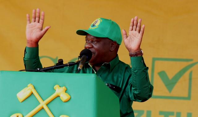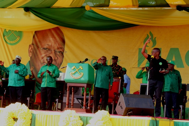 Mbunge mteule wa jimbo la Kongwa mkoani Dodoma Ndugu Job Ndugai akimuombea kura Rais Dk. John Pombe Magufuli kwenye mkutano wa kampeni unaofanyika kwenye uwanja wa Milambo mjini Urambo leo.