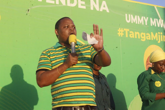 | KATIBU Mwenezi wa CCM wilaya ya Tanga Lupaskiyo Kapange akimuombea kura Ummy Mwalimu wakati wa mkutano huo |