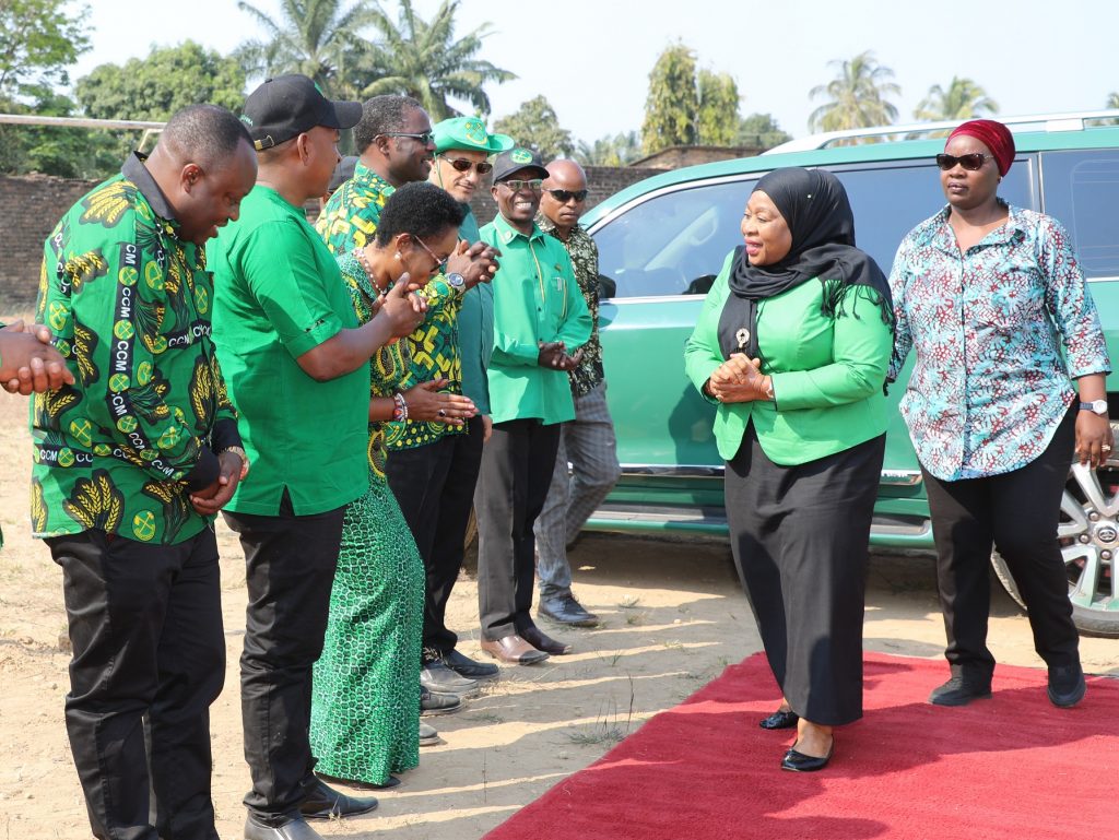 Mgombea Mwenza wa Kiti cha Urais wa Jamhuri ya Muungano wa Tanzania kwa tiketi ya CCM ambae pia ni Makamu wa Rais wa Jamhuri ya Muungano wa Tanzania Mhe. Samia Suluhu Hassan, akisalimiana na Viongozi na Wanachama wa Chama cha Mapinduzi CCM na Wananchi wa Jimbo la Kyela Mkoani Mbeya alipowasili katika Uwanja wa Mwakangale kwa ajili ya kuhutubia mkutano wa kampeni za Chama cha Mapinduzi CCM