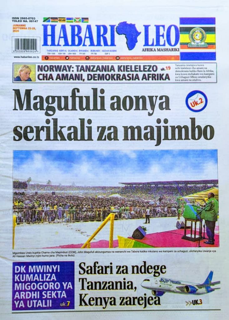MagazetiPITIA VICHWA VYA HABARI KATIKA MAGAZETI YA LEO SEPTEMBER 22,2020 Last updated: 2020/09/22 at 3:46 AM Alex Sonna 6 years ago Share SHARE Alex Sonna September 22, 2020 September 22, 2020 Share this Article Facebook Twitter Email Print Previous Article MAFUNZO PAMOJA NA USAJILI WA MAJENGO NA BIDHAA ZA CHAKULA NA VIPODOZI KWA WAFANYABIASHARA WA MKOA WA TANGA Next Article TARI YAANZA KWA KASI UTOAJI MAFUNZO KWA VITENDO KUINUA UBORA WA ZAO LA KOROSHO