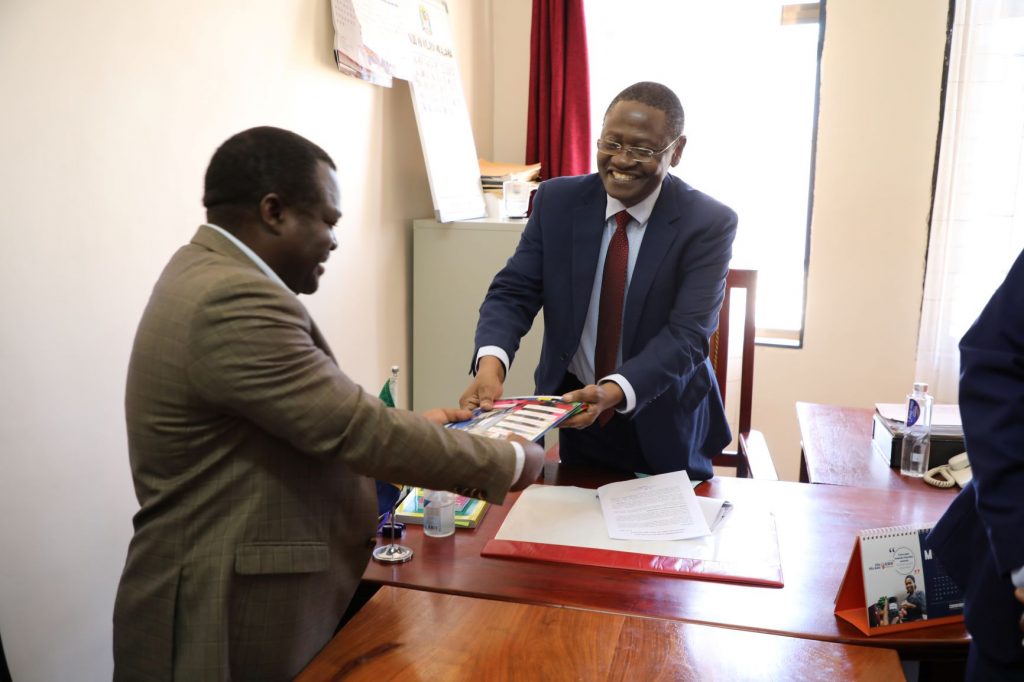 Jaji Mkuu wa Tanzania Mhe.Prof.Ibrahim Juma akimkabidhi machapisho ya Mahakama Mkuu ya wilaya ya Mkalama Mhandisi Masaka alipomtembelea ofisini kwake wakati wa ziara ya mkoani Singida.