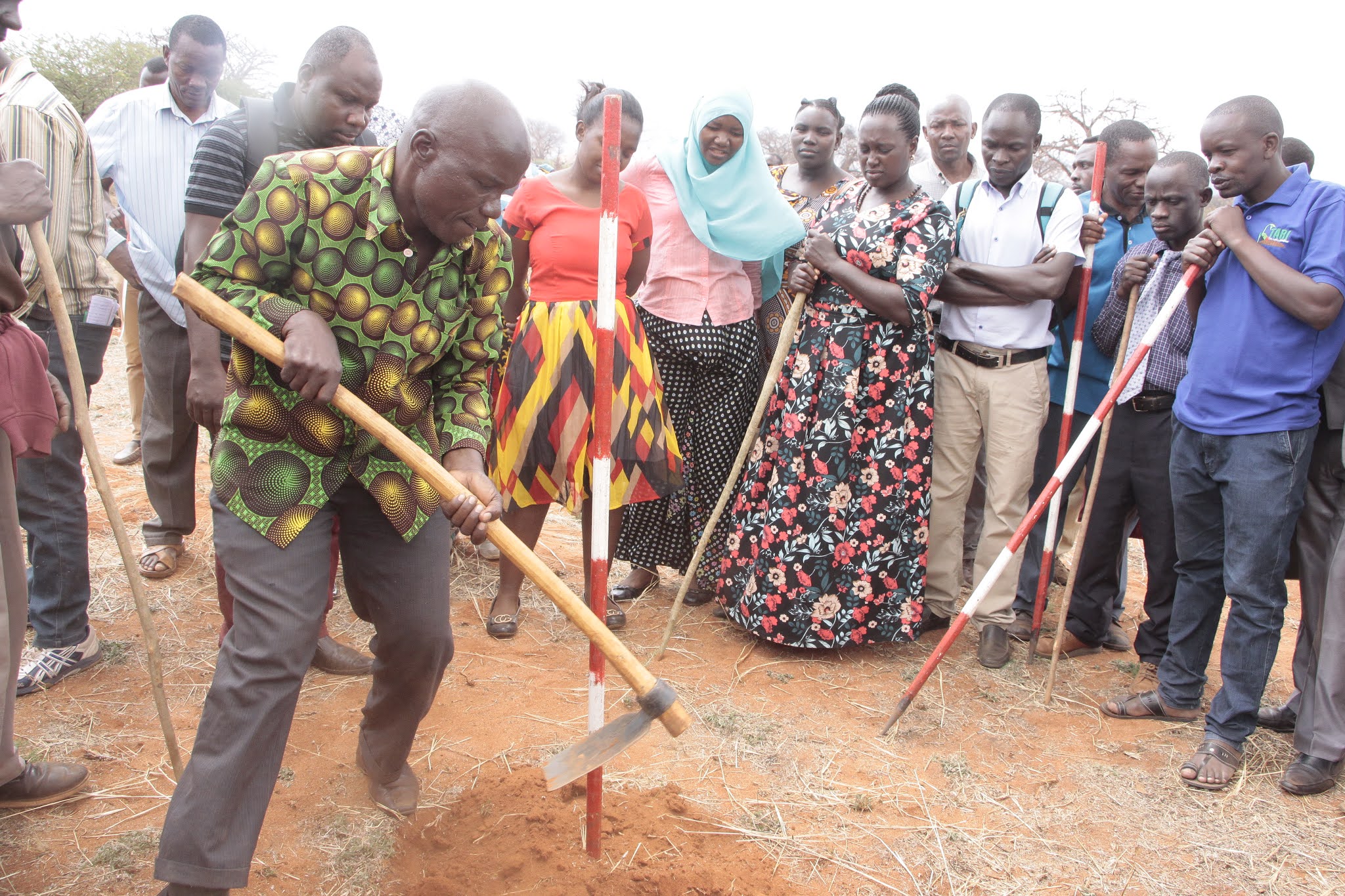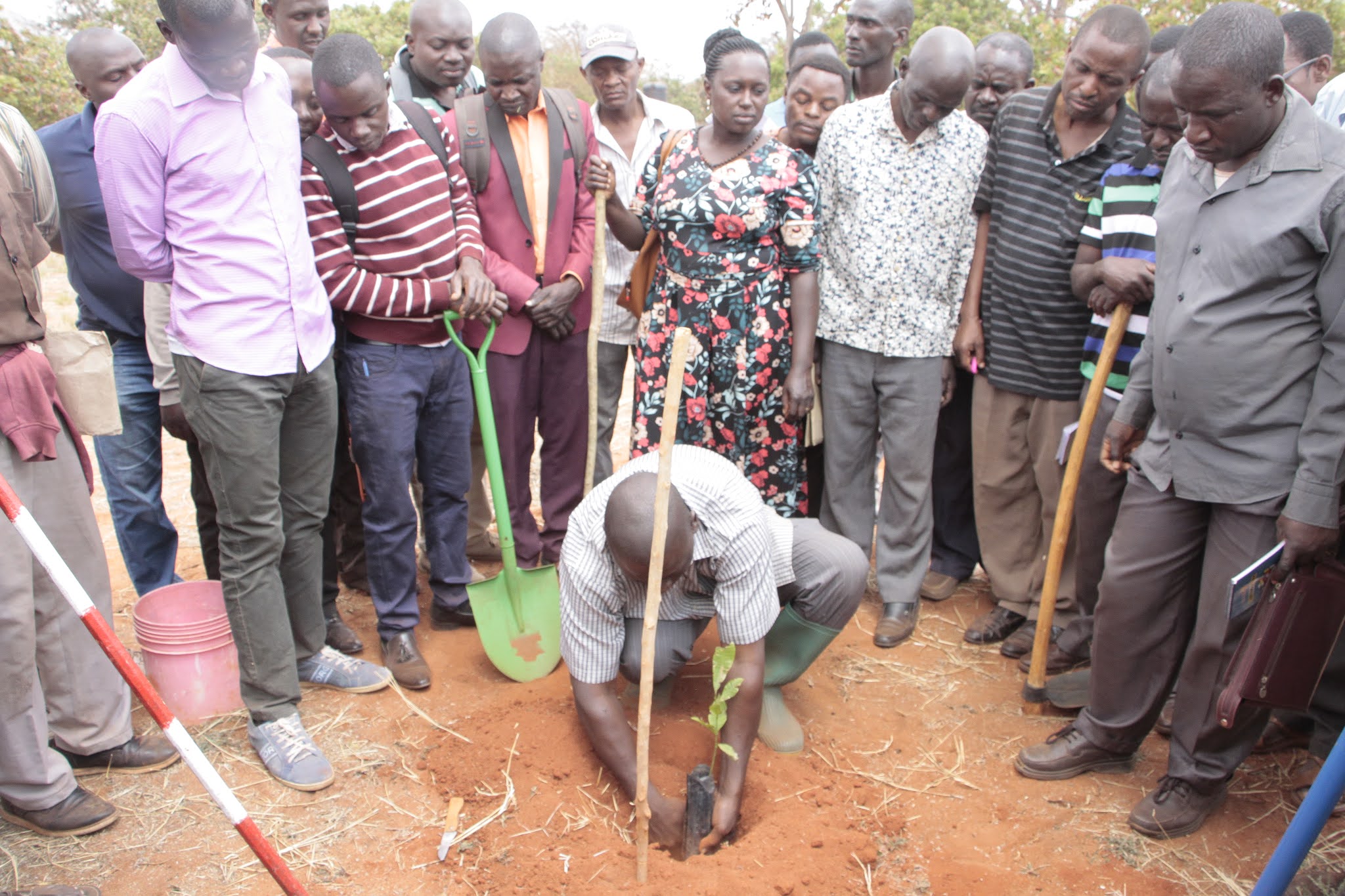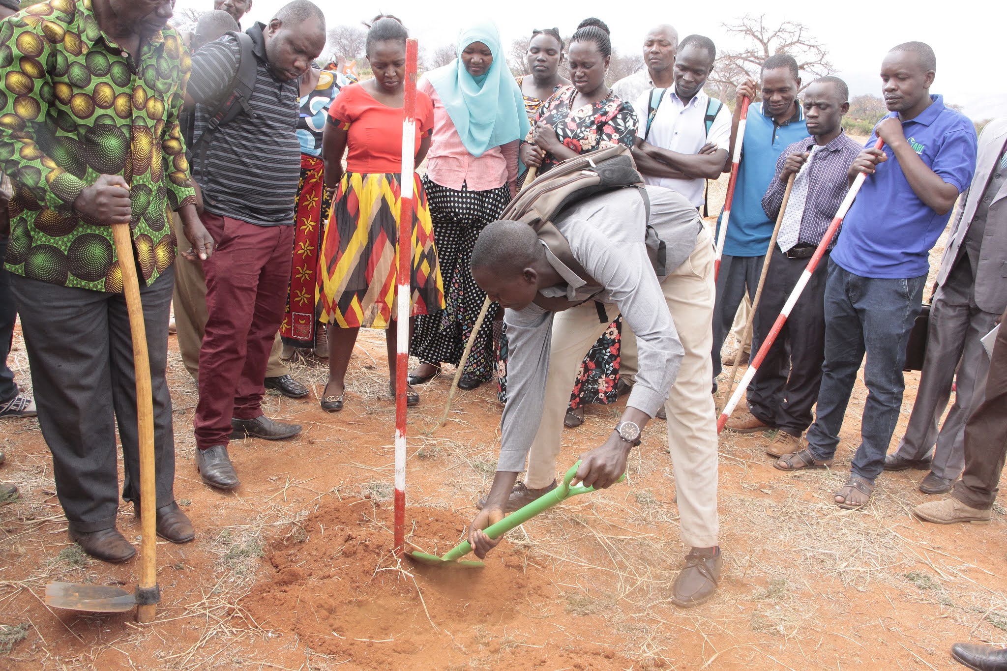 Afisa Kilimo kutoka Kata ya Chitego, Michael Edward, akishiriki mafunzo kwa vitendo kwa kuchimba mashimo katika shamba la mfano la korosho la Shule ya Sekondari Mnyakongo.