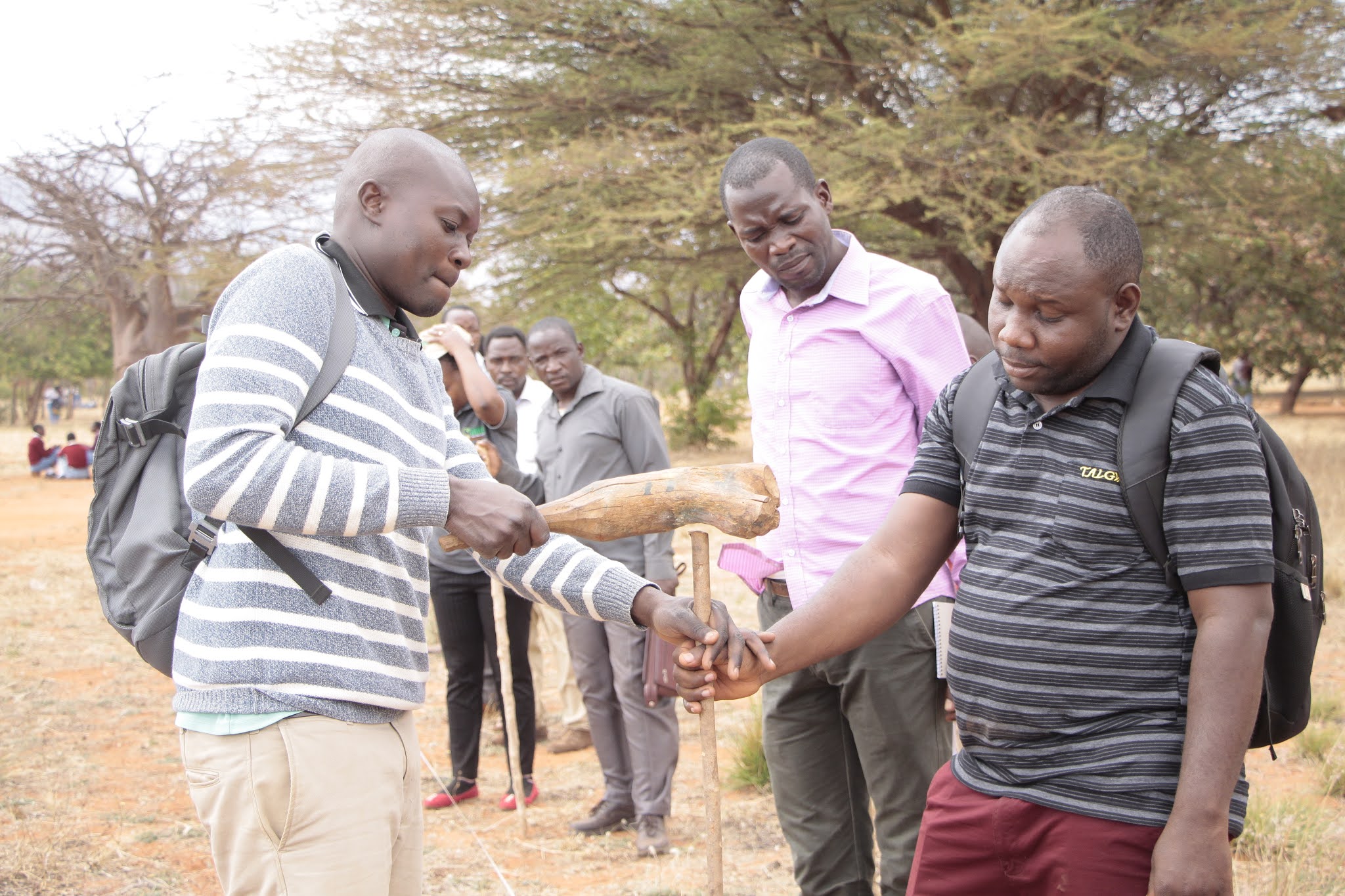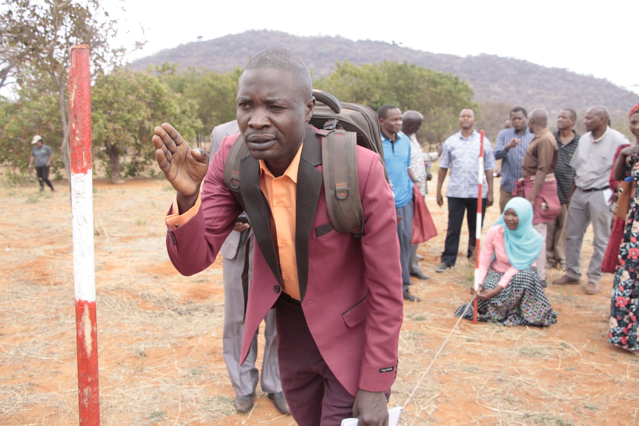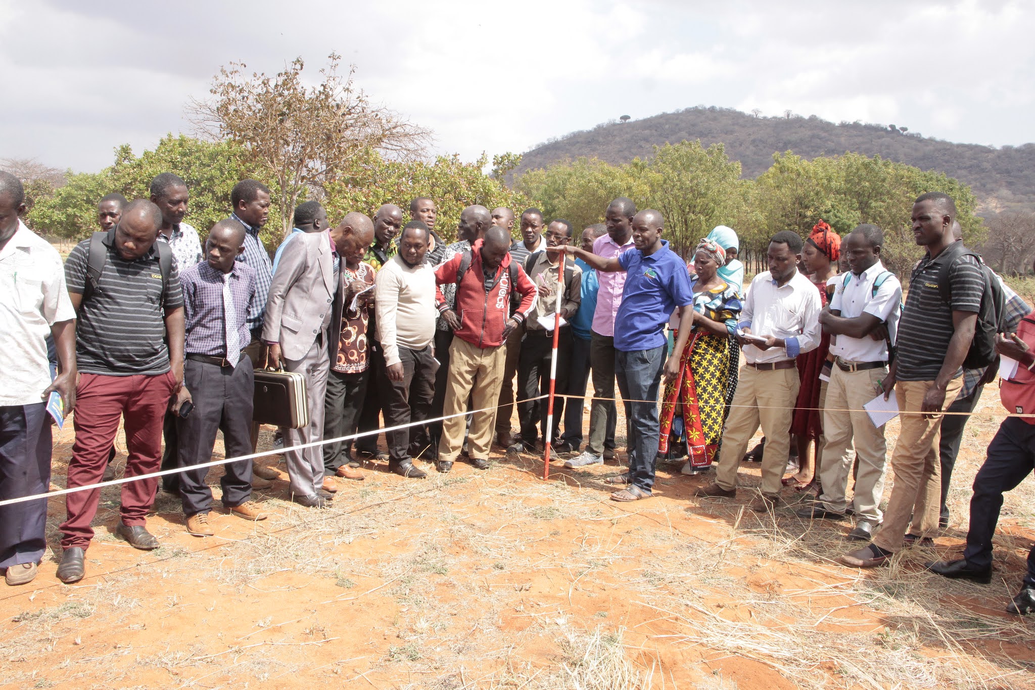 Afisa Kilimo kutoka Wilaya ya Kongwa, Elias Chilemue (kushoto) na wenzake, wakijifunza kutoka TARI namna ya kuweka alama wakati wa mafunzo kwa vitendo ya upimaji wa shamba la korosho.