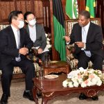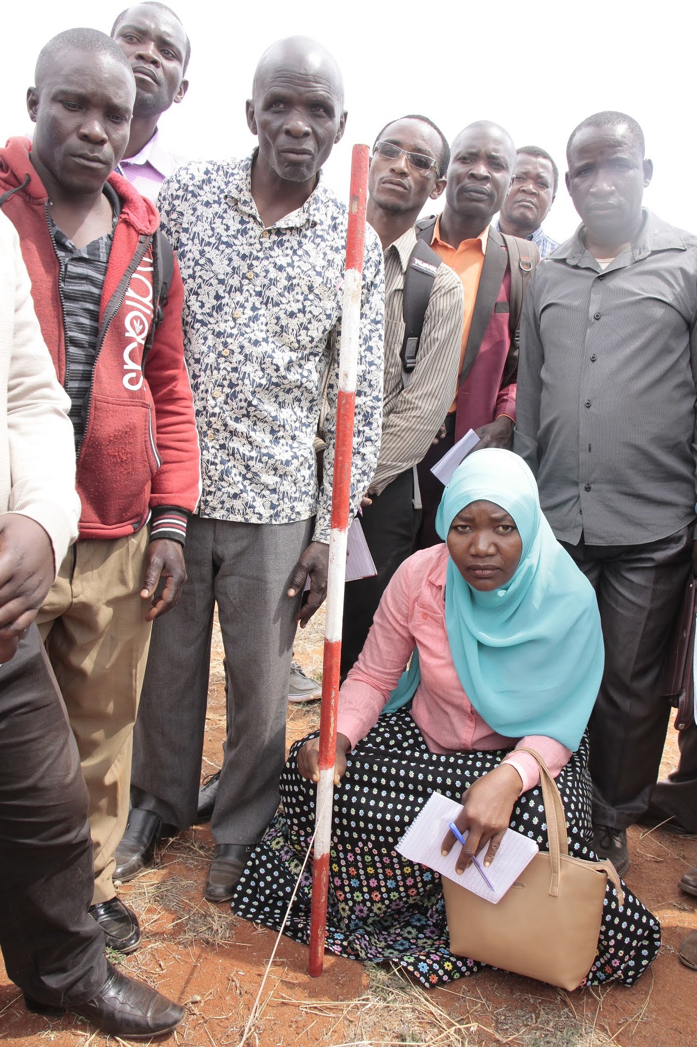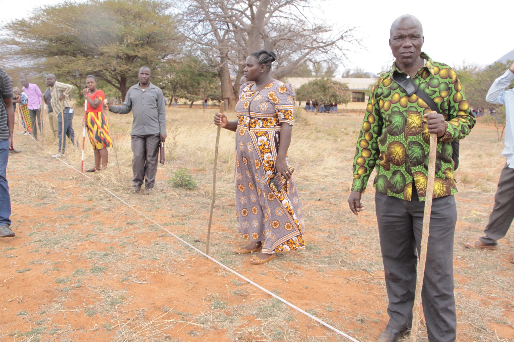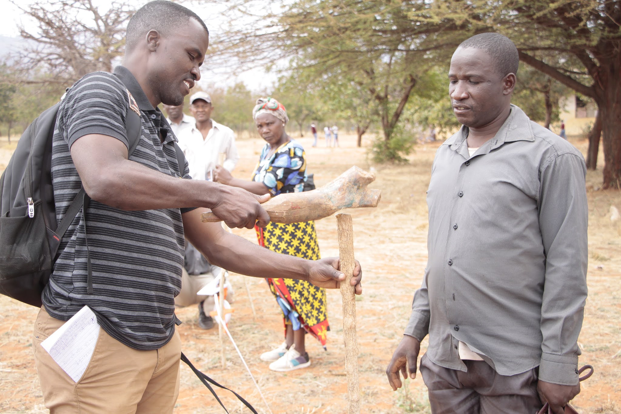 Afisa Kilimo kutoka Wilaya ya Kongwa, Elias Chilemue (kushoto) na wenzake, wakijifunza kutoka TARI namna ya kuweka alama wakati wa mafunzo kwa vitendo ya upimaji wa shamba la korosho.