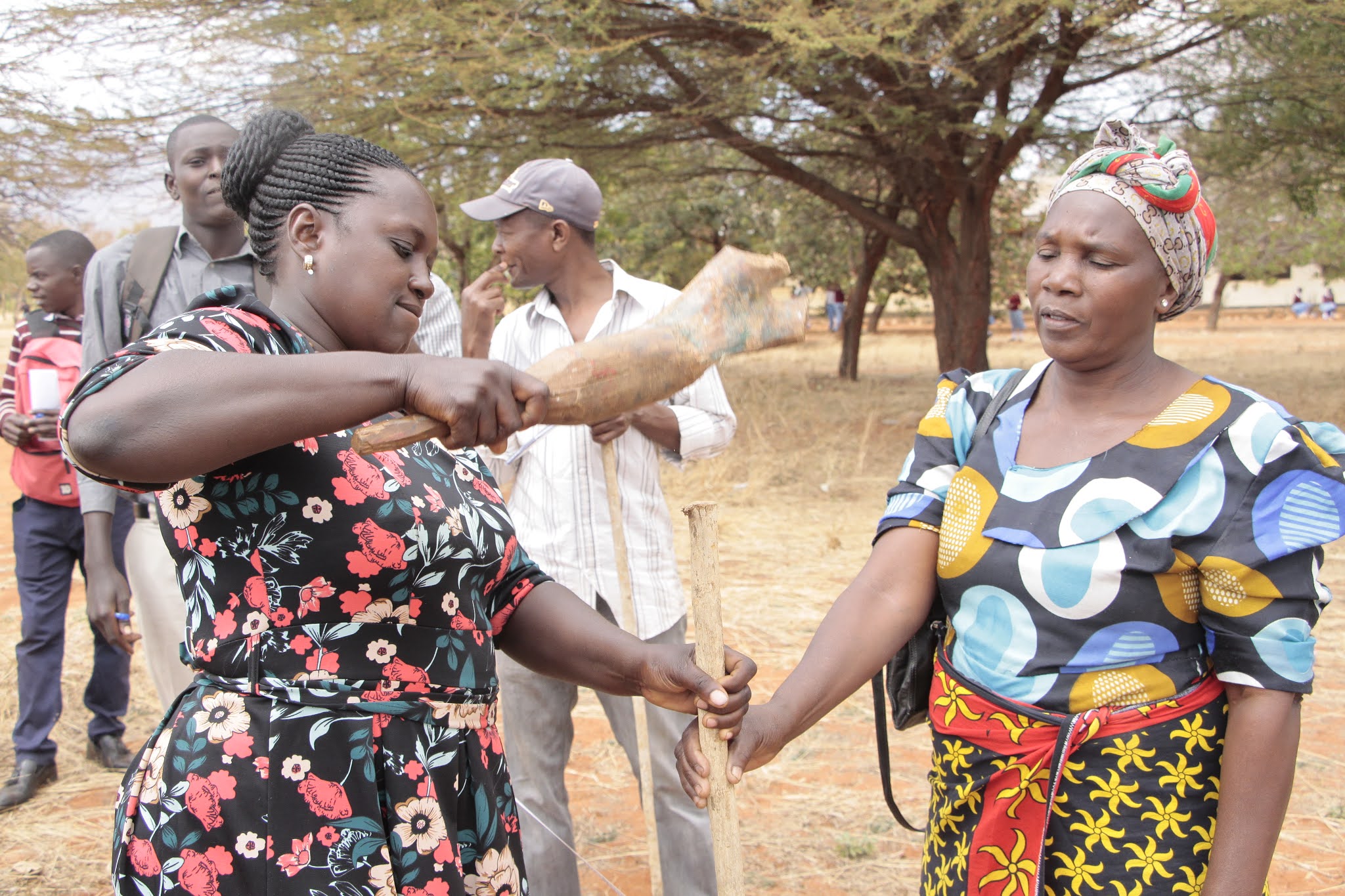 Mratibu wa Kitaifa wa Zao la Korosho kutoka Kituo cha Utafiti wa Kilimo TARI Naliendele Mtwara, Dkt.Geradina Mzena (kulia), akielekeza namna ya kunyosha mstari kwa kamba katika mafunzo hayo.