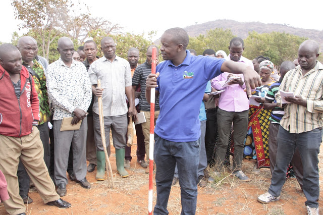 Afisa Kilimo, Said Kajagale kutoka Kata ya Ngomai akijifunza kunyoosha mstari kwa kuelekeza kwa mkono katika mafunzo hayo ya vitendo.