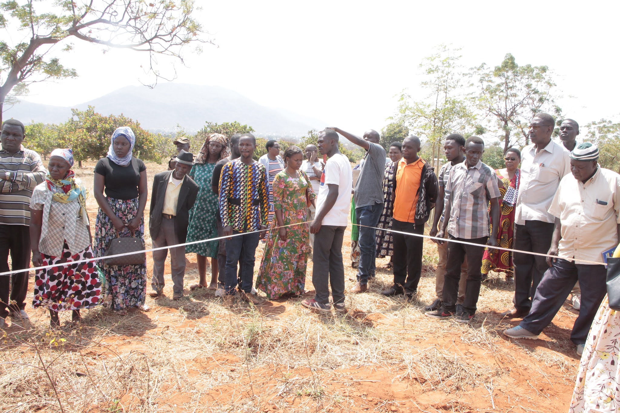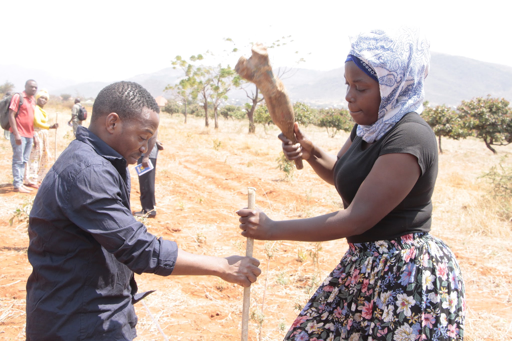 Afisa Kilimo kutoka Wilaya ya Mpwapwa, Kongwa, Malizia Said (kulia), akijifunza kutoka TARI namna ya kuweka alama wakati wa mafunzo kwa vitendo ya upimaji wa shamba la korosho.