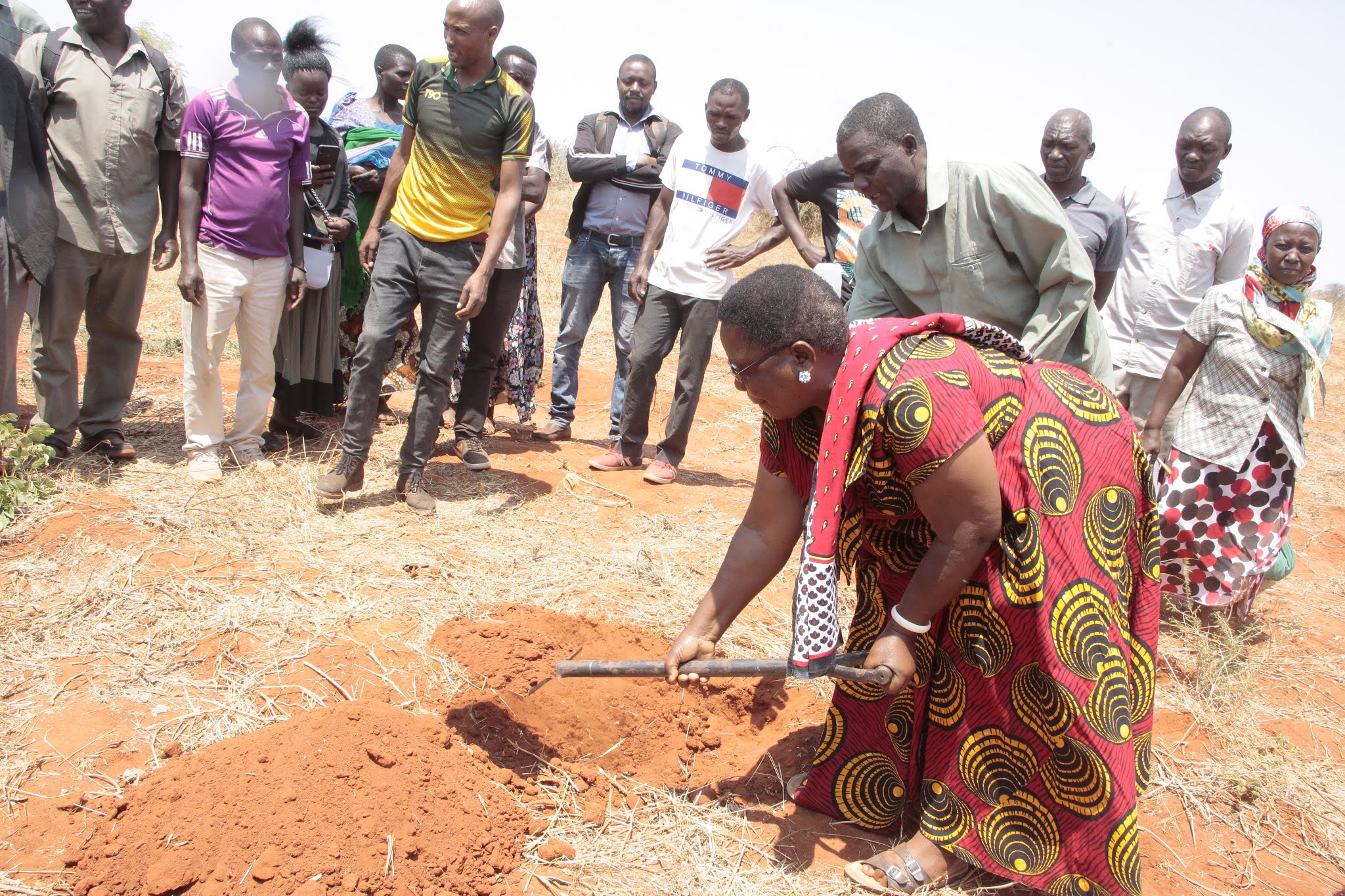 Mkulima Mary Mahinyila kutoka Mpwapwa mjini, akishiriki mafunzo kwa vitendo kwa kuchimba mashimo katika shamba hilo la Magereza la wilaya hiyo.