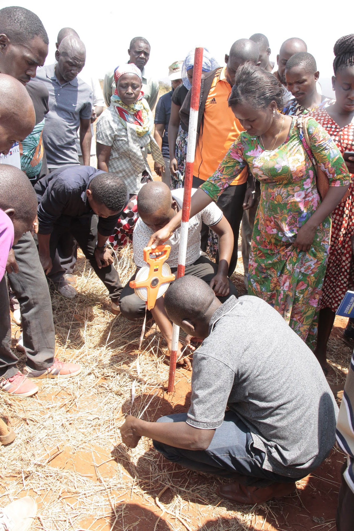 Afisa Kilimo kutoka Kata ya Ving’hawe, Bhoke Magere (kulia) na wenzake wakijifunza kutoka TARI namna ya kuweka alama wakati wa mafunzo kwa vitendo ya upimaji wa shamba la korosho.