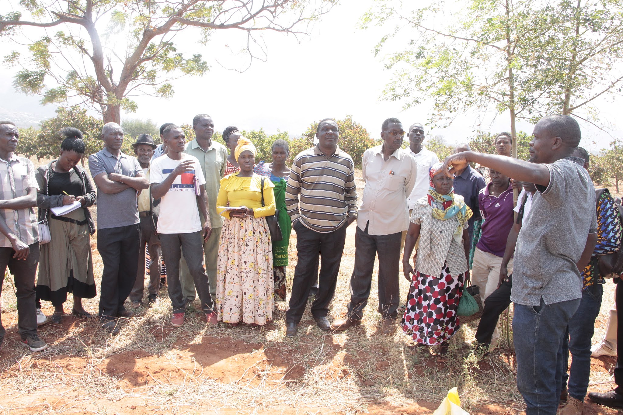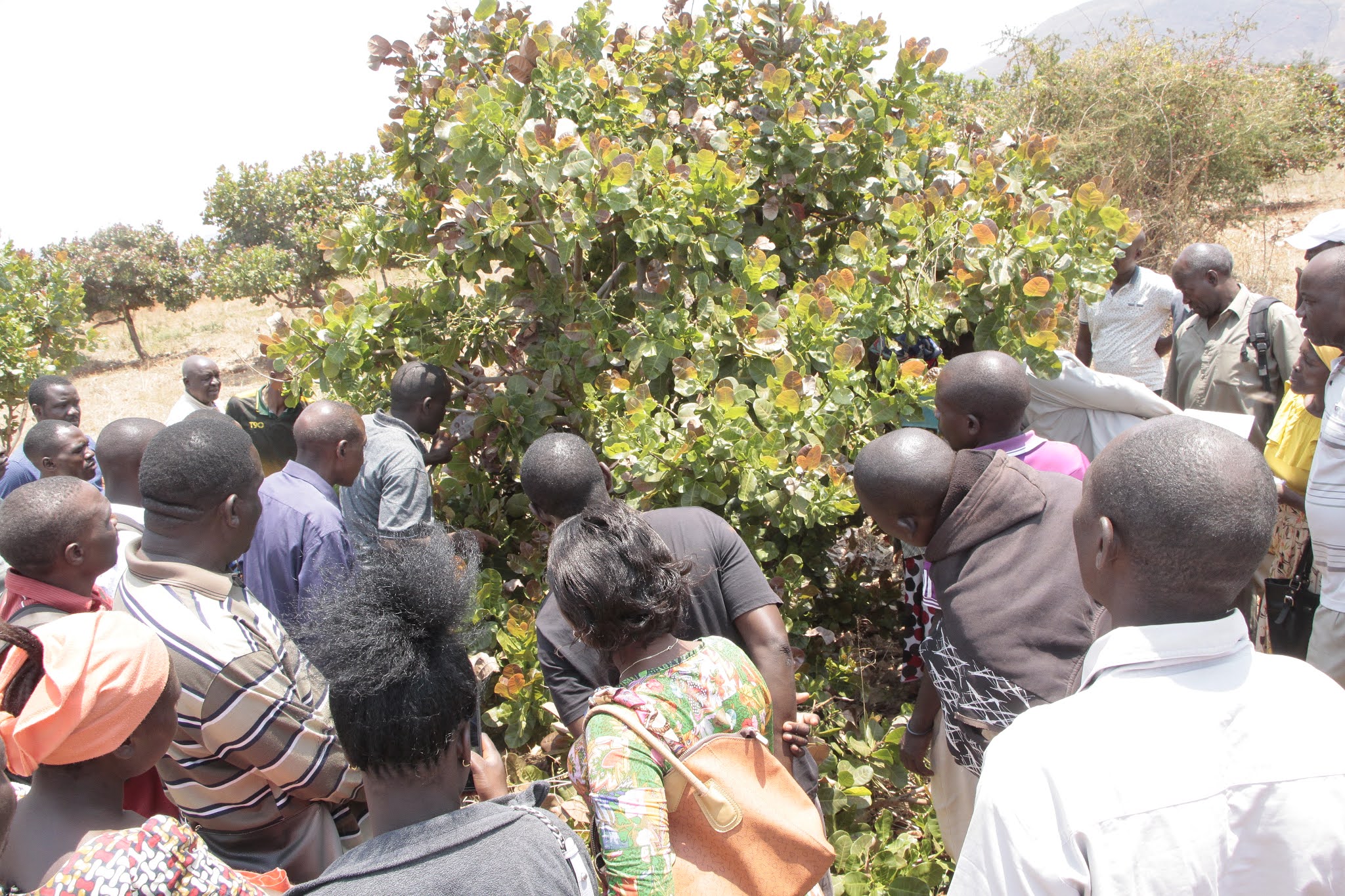 Maafisa Kilimo na Wakulima wa Halmashauri ya Wilaya ya Mpwapwa wakiangalia mkorosho ambao upo kama kichaka kwa sababu ya kuto pogolewa na kuhufanya husistawi vizuri.